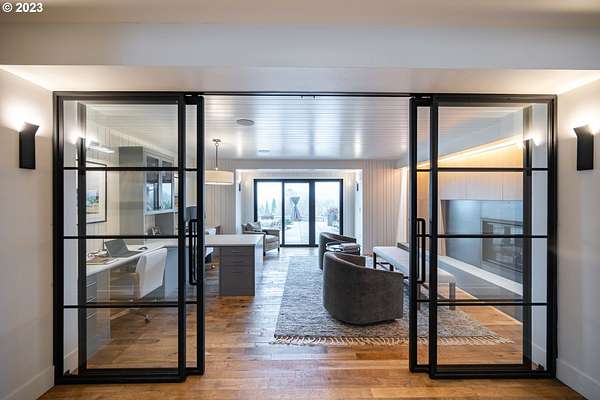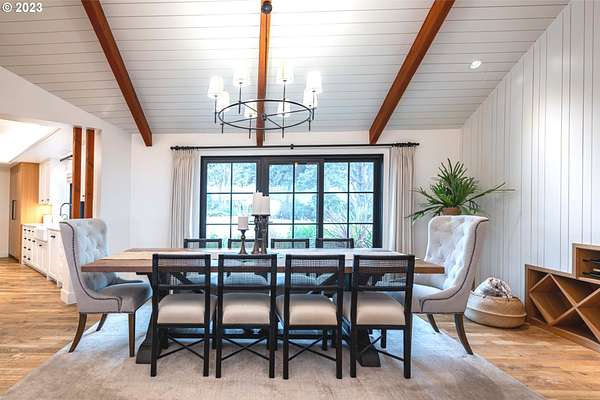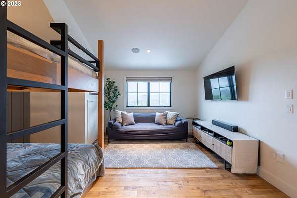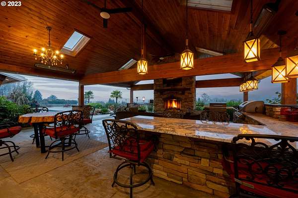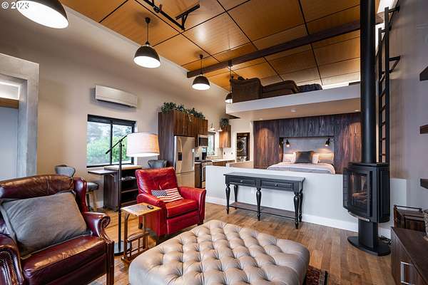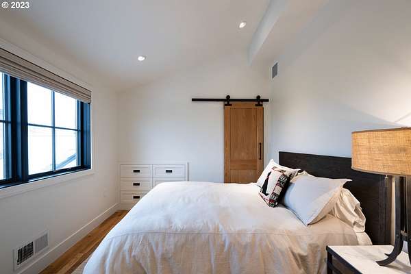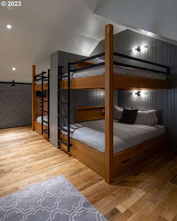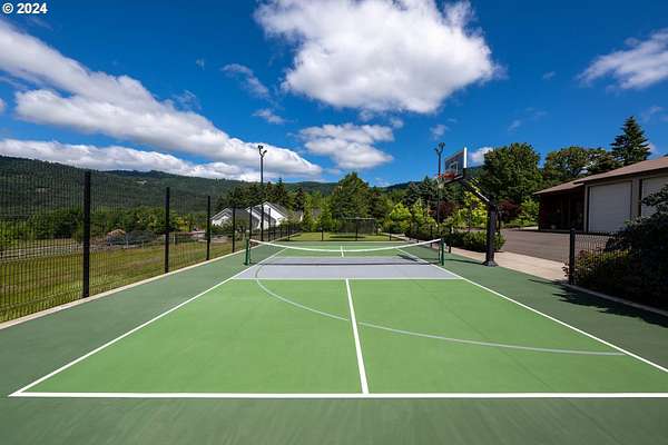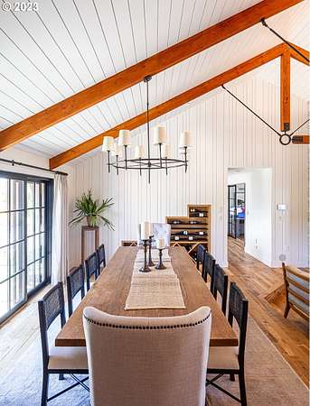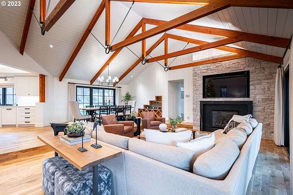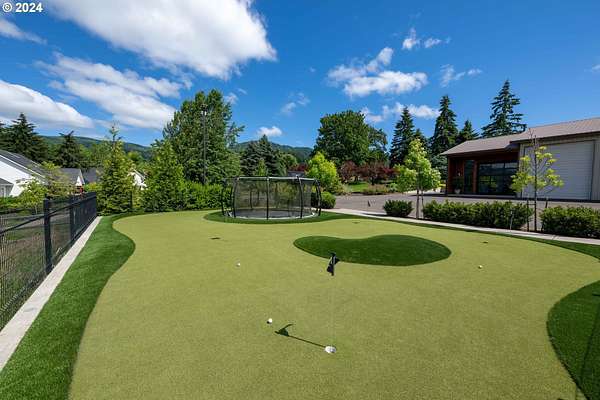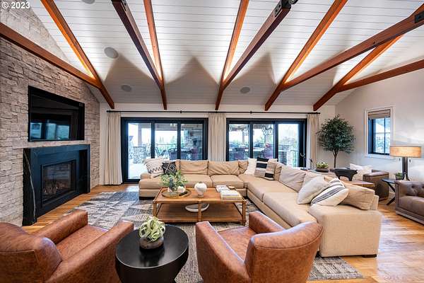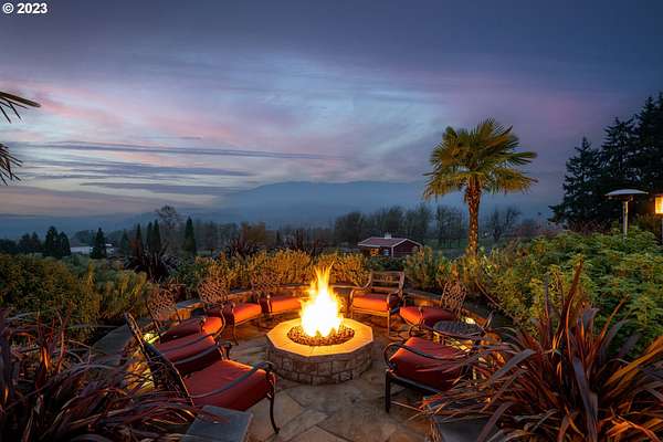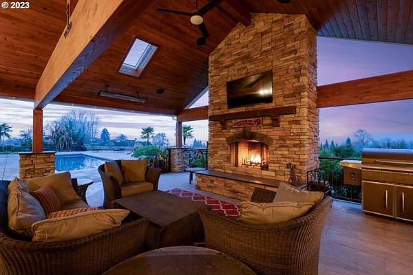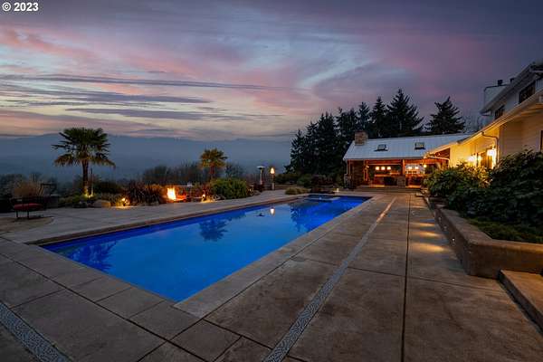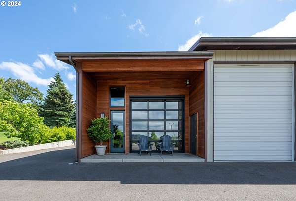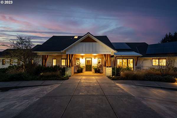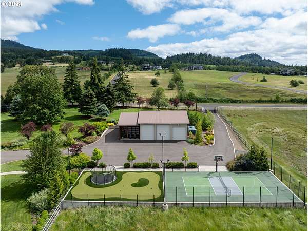 Nestled on nearly 10 acres, this masterfully crafted residence, designed by Arbor South and built by Mieli Construction, offers unmatched luxury. Enjoy breathtaking valley and Coburg Hills views, providing a picturesque backdrop for an extraordinary lifestyle. Step into the heart of this architectural masterpiece with a modern farmhouse kitchen featuring quartz counters, Sub-Zero fridge, Miele dishwasher, farm sink, and WOLF ovens. The great room boasts exposed beam vaulted ceilings, hardwood flooring, a stone gas fireplace, and seamless access to outdoor living.The main-level Owner's Suite offers a relaxing sanctuary with stunning views, a custom rain shower, elegant tilework, and a spacious walk-in closet. A connected workout room includes an additional full bath and sauna. Additional main-level features include an ensuite bedroom, a den with built-in desks, and extra living space highlighted by a sleek gas fireplace.Upstairs reveals another modern farmhouse-style bedroom, a full bath, and a charming bunk bedroom with 4 built in full sized beds. Premium air filtration and app-controlled HVAC ensure optimal comfort. The property showcases close-in country living with a legal Accessory Dwelling Unit, insulated and heated RV garage, greenhouse, shop, and a fully finished barn offering exceptional flexibility for recreation, hobbies, entertaining, or additional use. Solar panels enhance energy efficiency, and the fully fenced grounds include a security system and a sophisticated well system.Outdoor living is an art form with a landscaped yard featuring a swimming pool, outdoor kitchen with heaters and fireplace, granite counters, grill, fire pit, and a sports court with putting green, trampoline, and basketball/pickleball court. This exclusive estate blends architectural excellence, thoughtful design, and an idyllic close-in country setting.