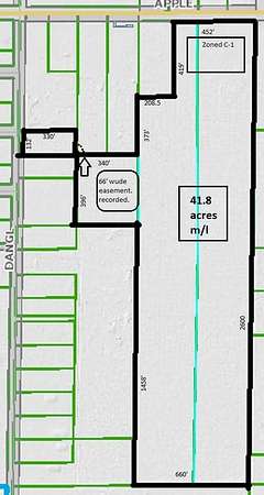 This property consists of 4 parcels:10025100002000, 10025100002000, 10025100000800, 0025100000110. 2 of them have commercial frontage on Apple Ave. High traffic location with over 40 ACRES of undeveloped property. Curb Cuts are in, Municipal water/sewer lines are in. Gorgeous, 4 bedroom, 2 bath totally remodeled brick home on the premises. Also, has a small apartment out back that could be rented out. Acreage has ingress/egress access from Apple Ave and also from Dangl Rd. Perfect for a new subdivision, new housing complex/condos/apartment buildings. Land Contract is avail. with 35% Down payment.