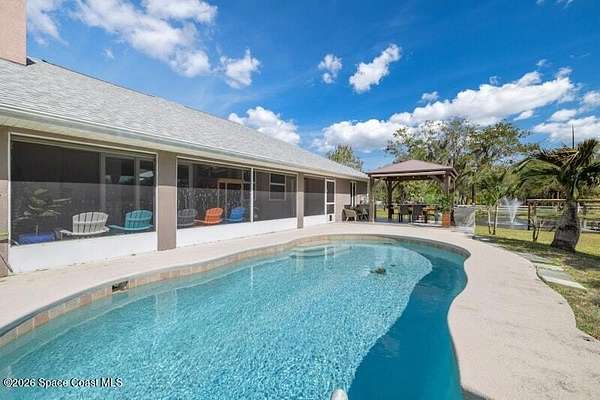 Need some space? Look no further because this one has it all! Available now is this modern home with a country feel. Very conveniently located close to Minton Road and I-95 means you get all the benefits of country living while still being close to all modern conveniences! This 2.5-acre estate boasts amazing outdoor spaces including producing fruit trees, gardens, pool, outdoor kitchen as well as a FULLY stocked pond with a refinished dock and fountain. The entire property is fenced in, and the extra-long driveway is protected by a private gate. The house itself is very spacious split floorplan with 3 bedrooms, 2 bathrooms, and a bonus room. Upon entry to the house, you are greeted by a very nice sized family room with the dining room to the left and the bonus room to the right. The family room leads out into the screened porch overlooking the pool and outdoor kitchen. The entire house has been upgraded with impact windows and doors to complete this one-of-a-kind property. Come see!
