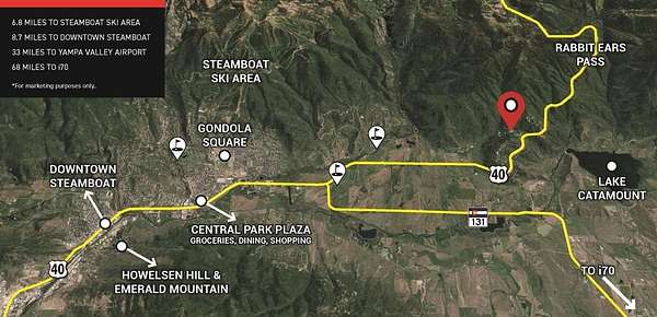 From Steamboat Springs, take US 40 east to Rabbit Ears Pass. Left on Sky Valley Drive. Property is on the right.