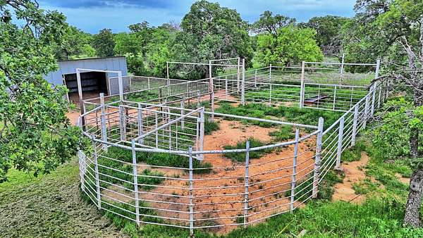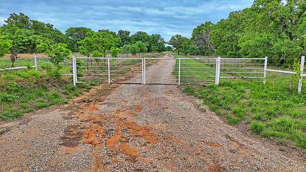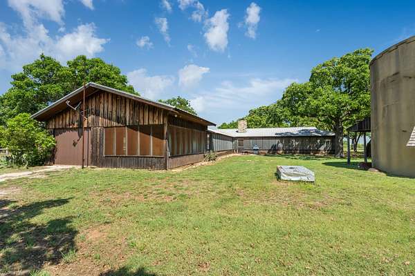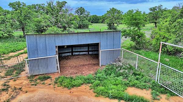 The property is thoughtfully set up for both residential and agricultural use. A 1,720 sq ft, 4-bedroom, 2-bathroom, ranch-style rock home with screened-in porches provides comfortable living, complemented by separate guest quarters for additional space for visitors. Improvements include a 60x60 shop with electricity and equipment apron, a 20x30 shop, and a 25x25 storage building, offering ample room for equipment, tools, and projects. A private water well with storage tank services the property, and pipe livestock pens are already in place to support cattle operations. The land features a mix of native grass pasture and heavy oak timber, along with a pond providing surface water. Easy access is available via Lodge Creek Road frontage.