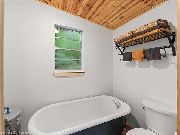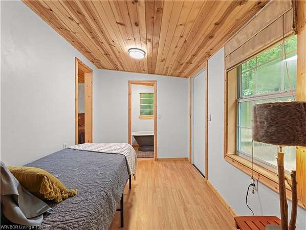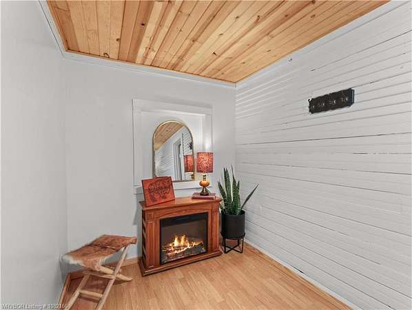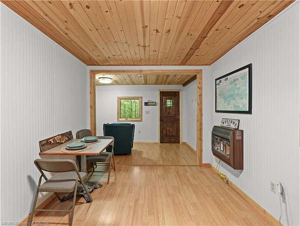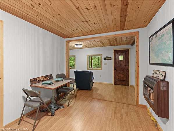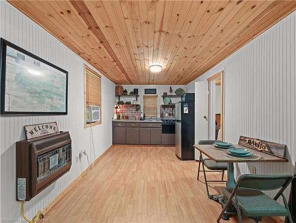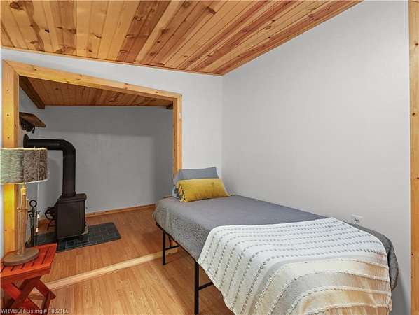 The property features a 2-bedroom, 1-bathroom cabin with a covered front porch and living room windows that overlook the front of the property. Inside, you'll find a cozy layout equipped with septic, a private well, water heater, and multiple heating sources, including an electric fireplace, wood stove, and space heater, as well as a window unit A/C for warm weather comfort. An electric pole is also installed, offering a convenient hookup for an RV--great for guests or additional rental options.