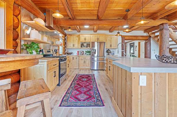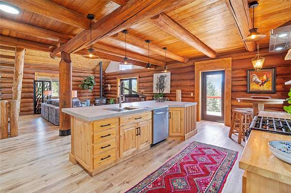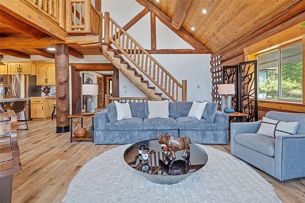 Set on 10 private, park-like acres minutes from Kalispell, this remodeled 4-bedroom, 5-bath log home offers privacy with everyday convenience, striking the perfect balance between rustic charm and modern comfort. The gourmet kitchen features upgraded appliances, stylish cabinetry, and a large island. Bathrooms are updated and include new baths with custom tile showers and soon-to-be-installed glass enclosures. The recently improved lower level expands the home with flexible additional living space. Other renovations include plumbing, electrical, sheetrock, windows and doors. The home, designed without interior load-bearing walls, has endless potential to support the dreams of its owner. The outdoor entertaining space has a wraparound deck, landscaped lighted entryway and a 32x32 shop. Equestrian potential, an extra building site, and Smith Valley views provide future flexibility. Nightly and weekly rentals are permitted, offering rare versatility for private living and/or income.