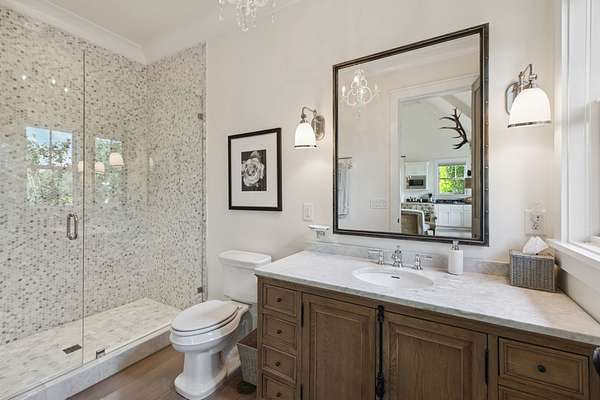 The main residence, 3385 Bailey Road, is as timeless as it is elegant. With its large wraparound porch, you'll capture both sunrise and sunset. Inside, the home features a great room ideal for entertaining, three upstairs ensuite bedrooms, a main-level office/guest room, and a chef's kitchen that serves as the heart of the home. Three fireplaces add warmth and character throughout. A full guest apartment with a private entrance, living room, kitchen, and bedroom sits above the oversized 3-car garage.