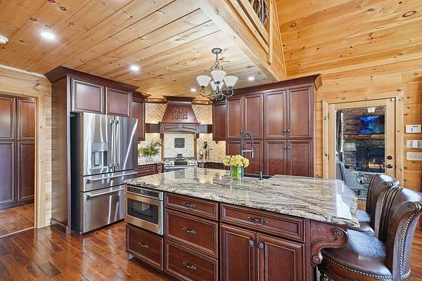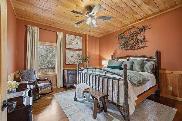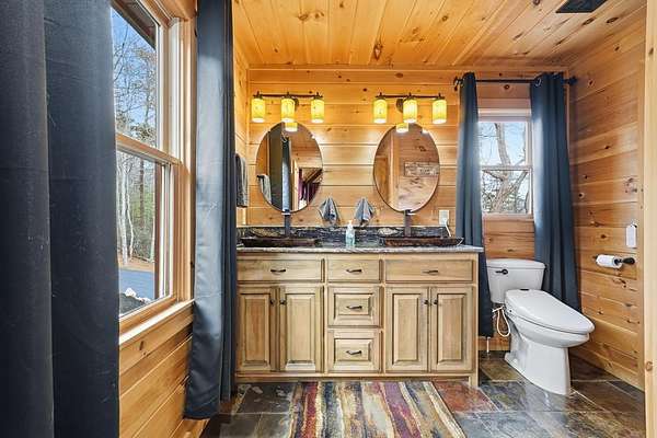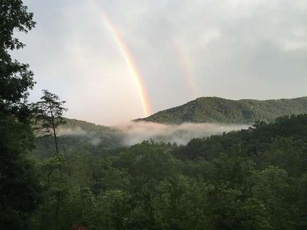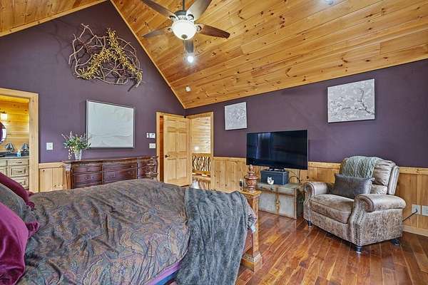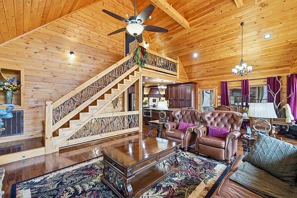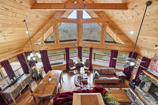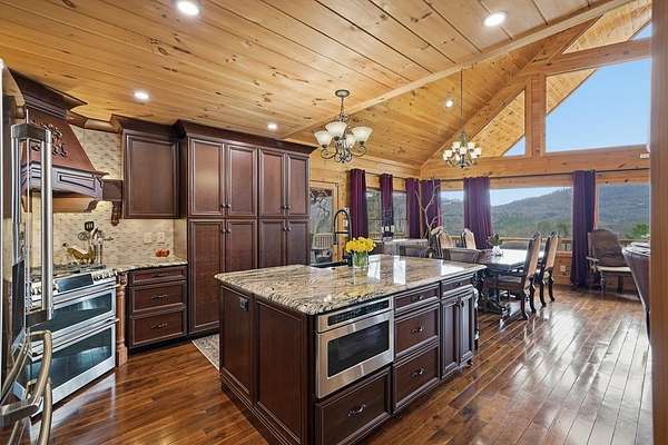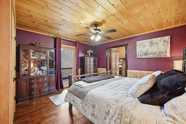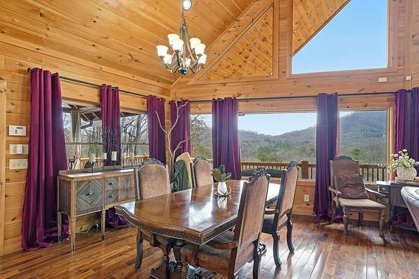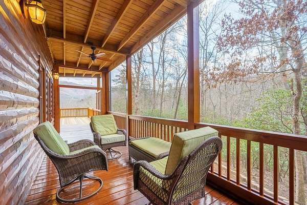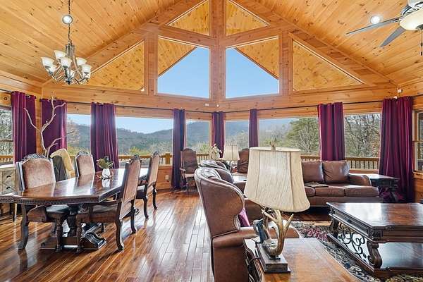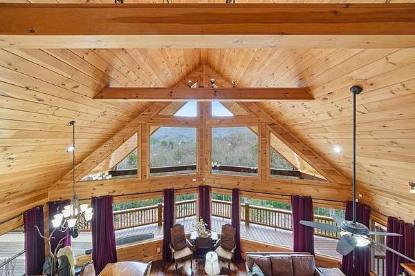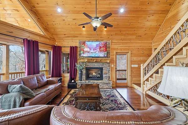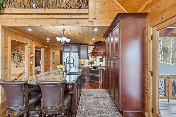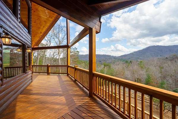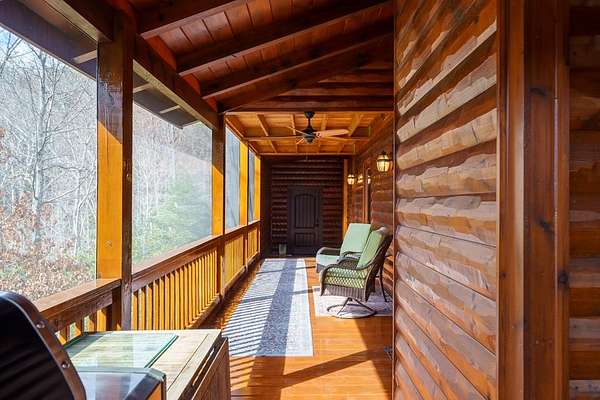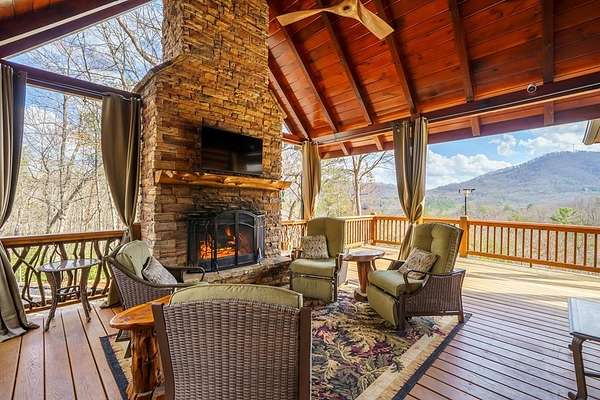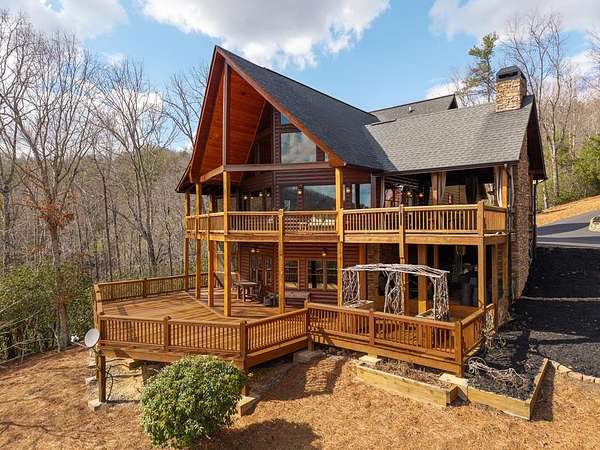 Nestled on a sprawling, meticulously-maintained 3-acre lot, this exceptional cabin offers breathtaking long-range mountain views and a rare blend of privacy & proximity to town. The recently refreshed landscaping features new straw & mulch, adding to the charm. Hand-scraped log siding and tongue & groove interior walls create an authentic mountain feel, the deck railing is complemented by hand-crafted pickets from laurel harvested on-site. Recent maintenance includes a fresh siding stain, the party porch ceiling, and all three screened porches. The remainder of all decking will be professionally stained in March. The main level boasts an open-concept living area with hardwood floors that offer stunning views from the vaulted wall of windows. The custom kitchen features soft-close cabinetry, GE Cafe stainless steel appliances, a large granite-topped island with a composite granite farmhouse sink. For added peace of mind, the gas logs have been professionally inspected by the gas company to ensure optimal functionality. The impressive main level primary suite features a hidden cabinet door entry leading to a spa-like bath with porcelain floors, a Finnleo sauna, and a roll-in shower. Step-free, covered access to the oversized 2-car garage is provided, with a built-in lift for easy transportation of storage items. Outdoor living is further enhanced by newly installed deck boards and replaced deck railings. Upstairs, the second primary bedroom is totally secluded with a private screened deck. The en suite bath features a dual vanity and a gorgeous slate tiled step-in shower. The terrace level expands the living space with a large entertainment area, a wet bar, and a spacious guest bedroom. With a Generac generator, low-maintenance gutter guards, & quality construction by the esteemed local builder Brandon Mathis, this home seamlessly blends classic cabin charm with refined, move-in-ready luxury. This cabin truly lives up to its name, offering an extraordinary experience!