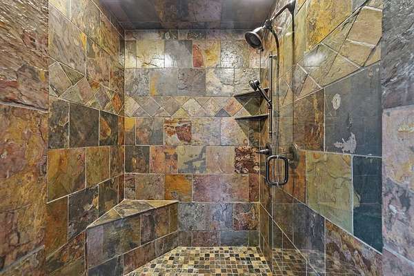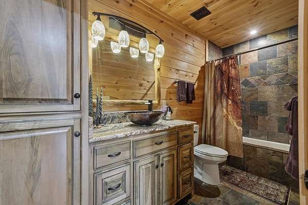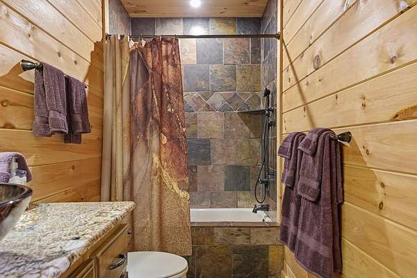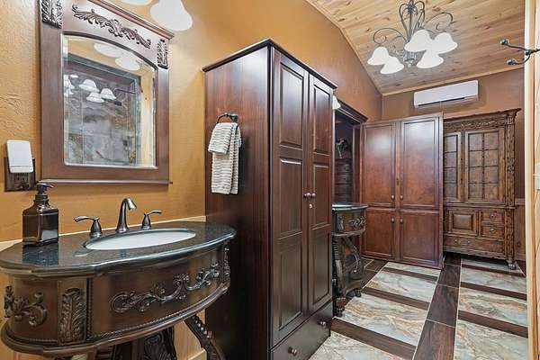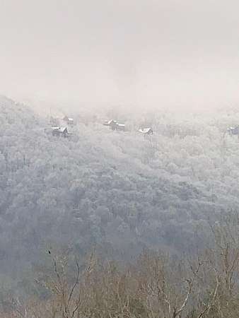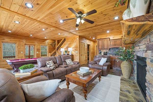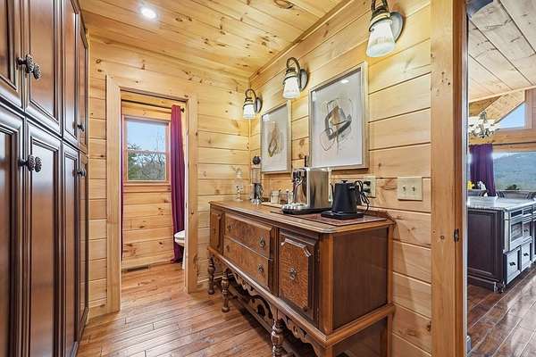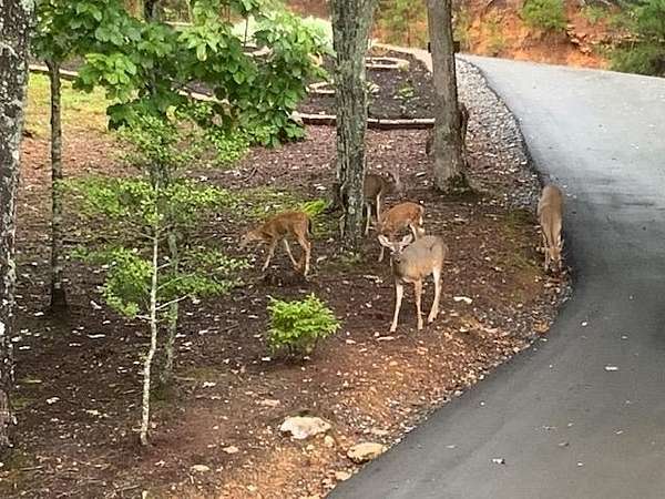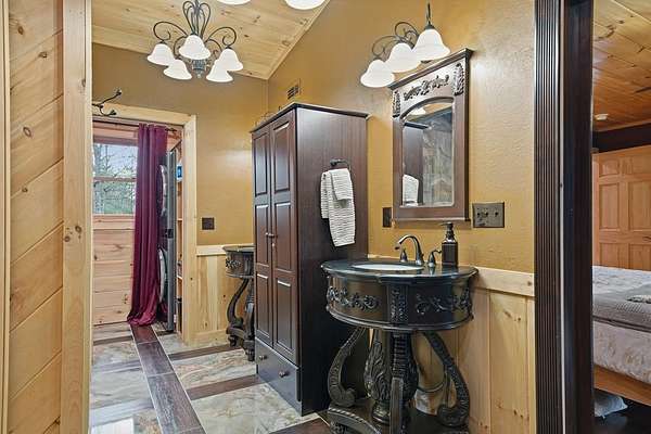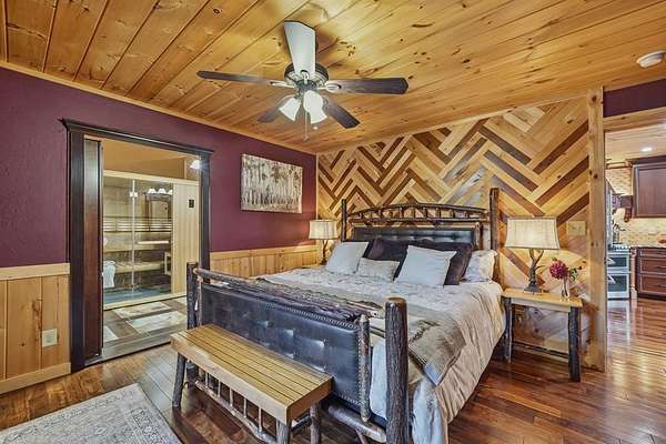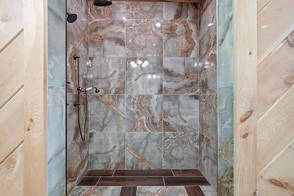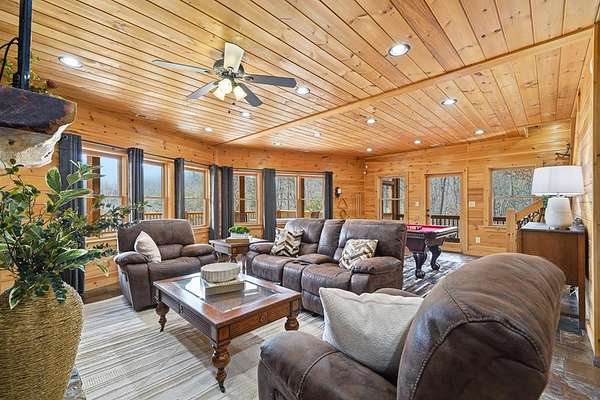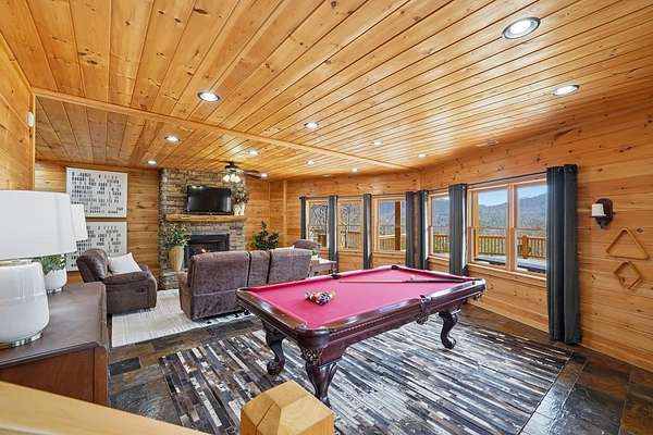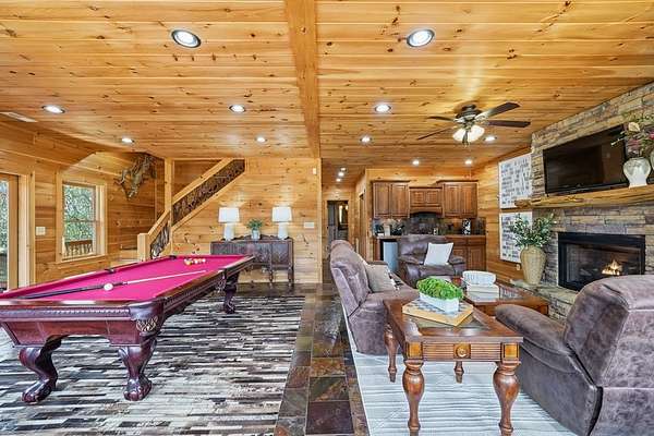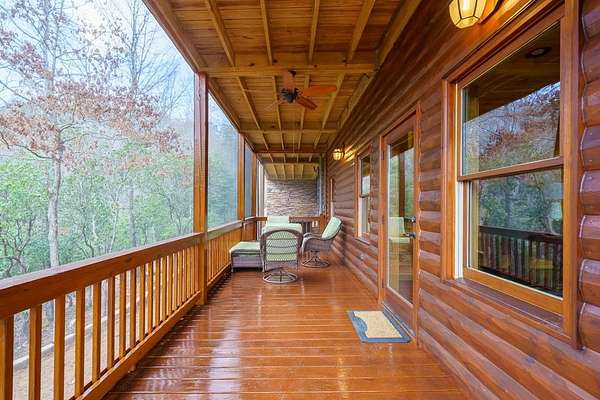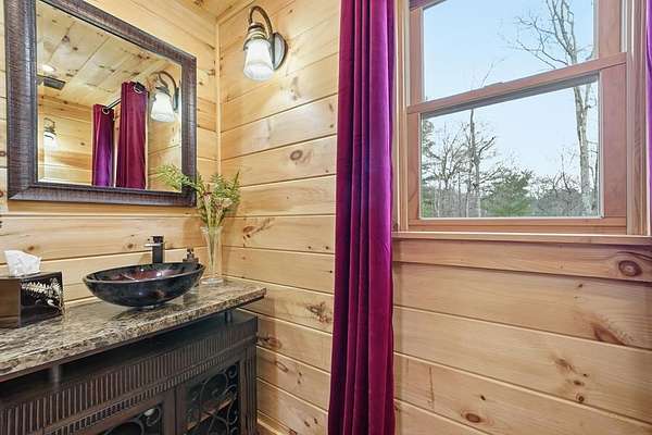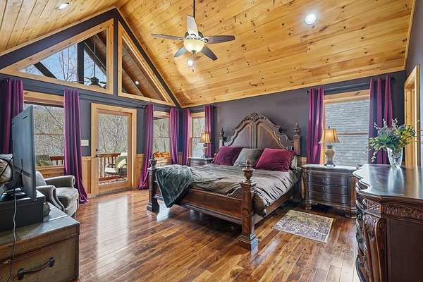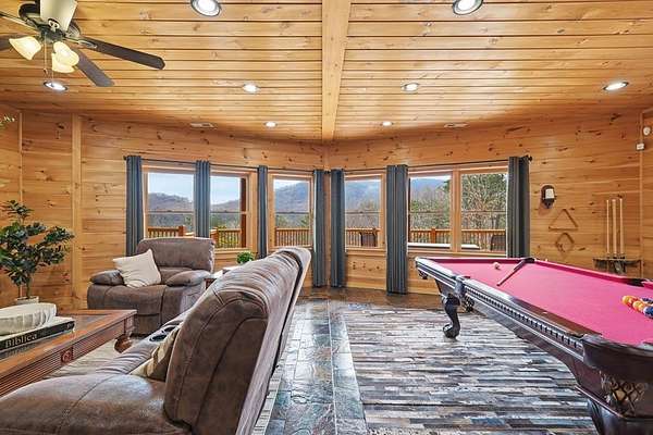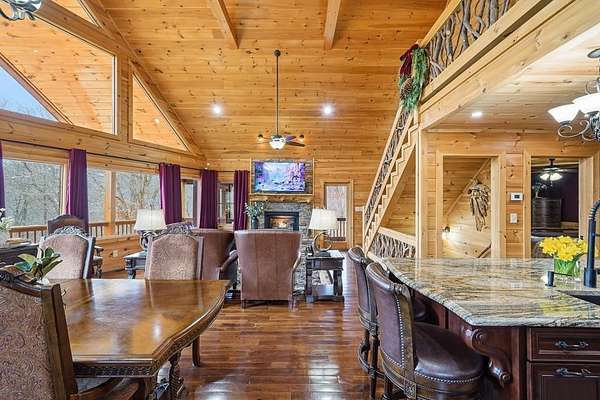 Nestled on a sprawling, meticulously-maintained 3-acre lot, this exceptional cabin offers breathtaking long-range mountain views and a rare blend of privacy & proximity to town. The recently refreshed landscaping features new straw & mulch, adding to the charm. Hand-scraped log siding and tongue & groove interior walls create an authentic mountain feel, the deck railing is complemented by hand-crafted pickets from laurel harvested on-site. Recent maintenance includes a fresh siding stain, the party porch ceiling, and all three screened porches. The remainder of all decking will be professionally stained in March. The main level boasts an open-concept living area with hardwood floors that offer stunning views from the vaulted wall of windows. The custom kitchen features soft-close cabinetry, GE Cafe stainless steel appliances, a large granite-topped island with a composite granite farmhouse sink. For added peace of mind, the gas logs have been professionally inspected by the gas company to ensure optimal functionality. The impressive main level primary suite features a hidden cabinet door entry leading to a spa-like bath with porcelain floors, a Finnleo sauna, and a roll-in shower. Step-free, covered access to the oversized 2-car garage is provided, with a built-in lift for easy transportation of storage items. Outdoor living is further enhanced by newly installed deck boards and replaced deck railings. Upstairs, the second primary bedroom is totally secluded with a private screened deck. The en suite bath features a dual vanity and a gorgeous slate tiled step-in shower. The terrace level expands the living space with a large entertainment area, a wet bar, and a spacious guest bedroom. With a Generac generator, low-maintenance gutter guards, & quality construction by the esteemed local builder Brandon Mathis, this home seamlessly blends classic cabin charm with refined, move-in-ready luxury. This cabin truly lives up to its name, offering an extraordinary experience!