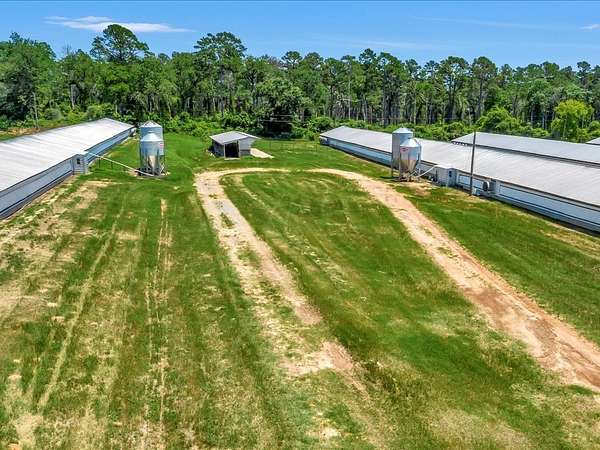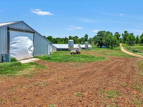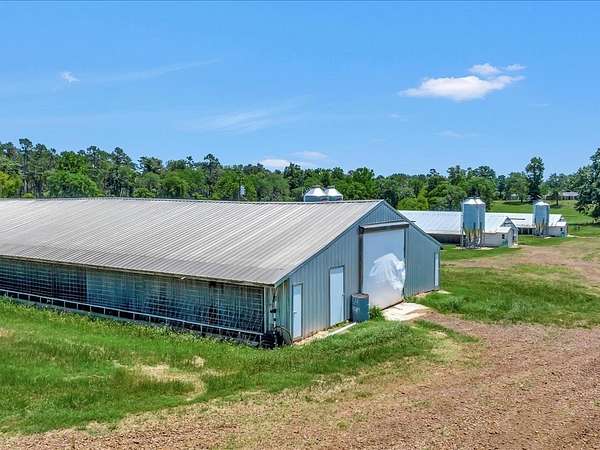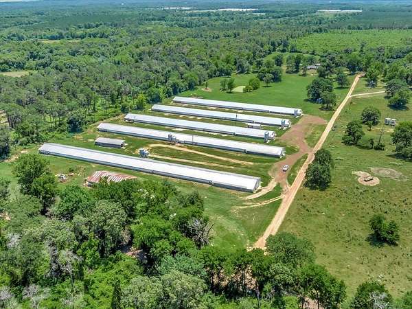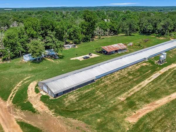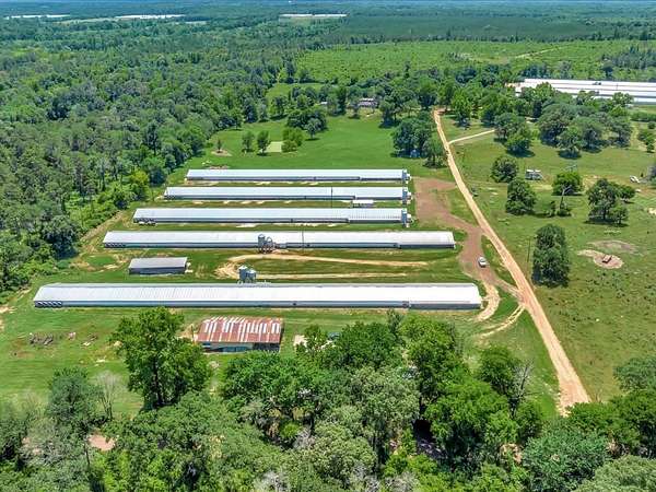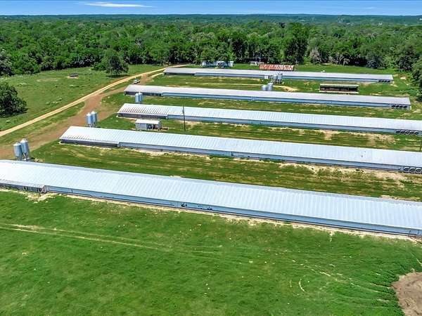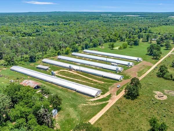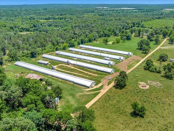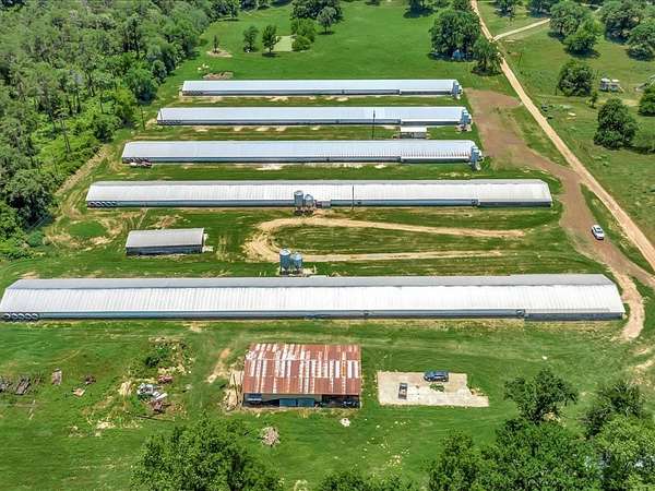 10.92 acres in Garrison, Texas with Mobile Home and 5 previous use poultry houses. 1988 construction with several retrofits over the years, house 1 & 2 are 36' x 450' and built in 1994 with several retrofits over the years, houses 3, 4, & 5 are 40' x 400'. The poultry houses have been out of use since July 2025. Water is provided by well with community water back up.