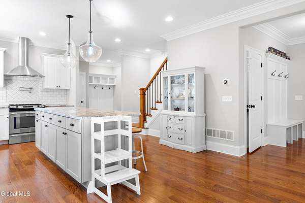 - Built-In Features, Crown Molding, Eat-In Kitchen, High Speed Internet, Kitchen Island, Paddle Fan, Solid Surface Counters, Tray Ceiling(s), Walk-In Closet(s)