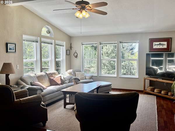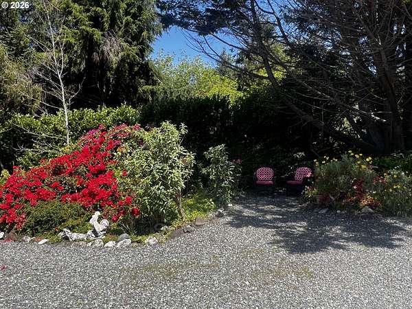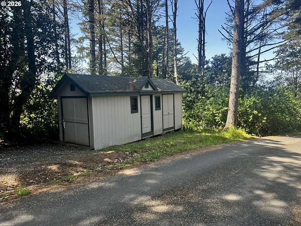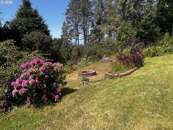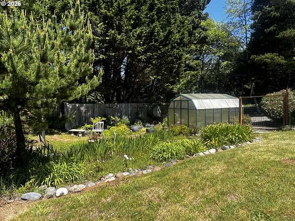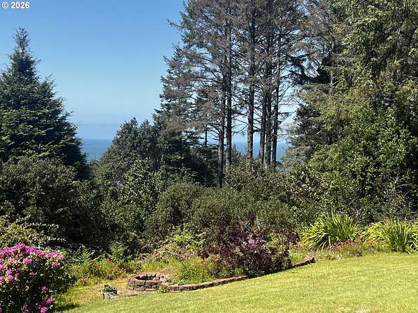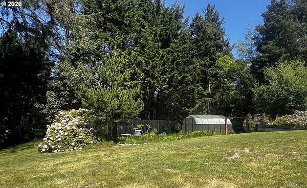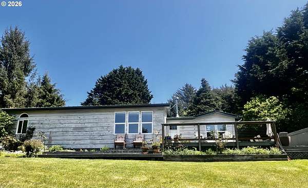Nestled on 5 private acres with ocean views, this charming 3-bedroom, 2-bath home offers the perfect blend of comfort, beauty, and functionality. A welcoming circular drive provides easy access and adds to the property's curb appeal. Enjoy peaceful trails winding throughout the property, a serene pond, expansive flowering shrubs, and an orchard. Outdoor living shines with an oversized deck, outdoor shower, dedicated dog-washing area, hot tub, greenhouse, fenced garden area, and multiple storage sheds.The property includes a detached oversized 2-car garage, a large attached RV covered parking area, detached garden shed, and plenty of room for all your toys and tools. Offered furnished, this private retreat is just minutes from the beach, the Rogue River, and Cedar Bend Golf Course. A rare opportunity to enjoy coastal living with privacy, convenience, and endless charm!