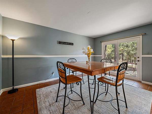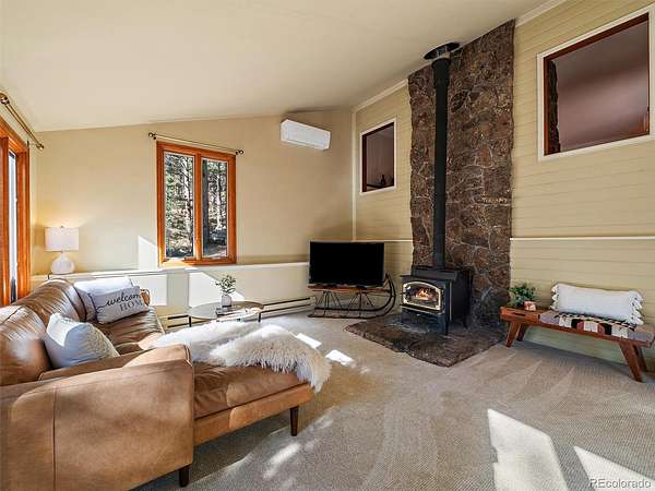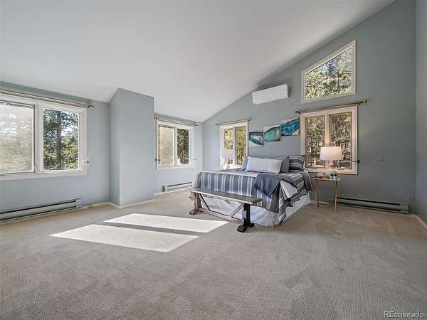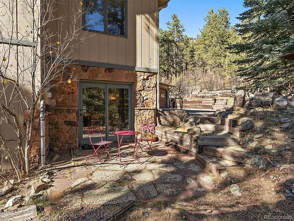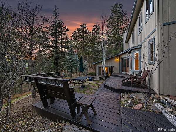 Have you dreamed of a tranquil escape nestled in the heart of Evergreen's iconic Upper Bear Creek, where peace and privacy reign supreme? Welcome to this wonderful 3 Bed, 3 Bath retreat, perfectly situated on a rolling, mitigated 10-acre lot, offering a serene lifestyle away from the hustle and bustle of traffic. Cherished by its owners for nearly 40 years, this home greets you with pristine walnut hardwood floors and a stunning chandelier in the foyer. The main level is bathed in natural light, featuring a spacious den anchored by a captivating moss rock wood-burning fireplace and views of forest and rock formations. The heart of this home is the updated eat-in kitchen. Blonde maple hardwood floors complement a butcher block island, blending beautifully w/KitchenAid stainless steel appliances, including double convection ovens and a Jen Air cooktop. Granite countertops and generous walk-in pantry complete this culinary haven. Adjacent to the kitchen, the dining room opens to a charming flagstone patio, perfect for alfresco dining. A cozy breakfast nook leads to a second flagstone patio on the back deck, ideal for enjoying morning coffee amidst nature. The bright living room features soaring ceilings, cozy wood stove, and mini-split system ensuring year-round comfort. Walk out to another flagstone patio. A powder bath finishes off this level. Upstairs, the spacious primary suite boasts serene views. The en-suite bath features executive height counters, herringbone tile, and a custom shower, alongside a walk-in closet w/built-ins. Two additional generous sized light-filled bedrooms with forest views, a full bath, and laundry area complete this level. An oversized two-car garage with a bonus heated area, perfect for a workshop or gym with exterior access. With Pella windows and doors, new carpeting throughout, this home is move-in ready. This exceptional property offers a rare opportunity to own a private mountain sanctuary in coveted Upper Bear Creek. Don't miss it!