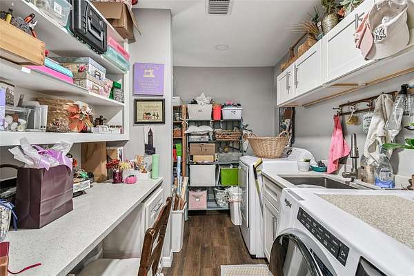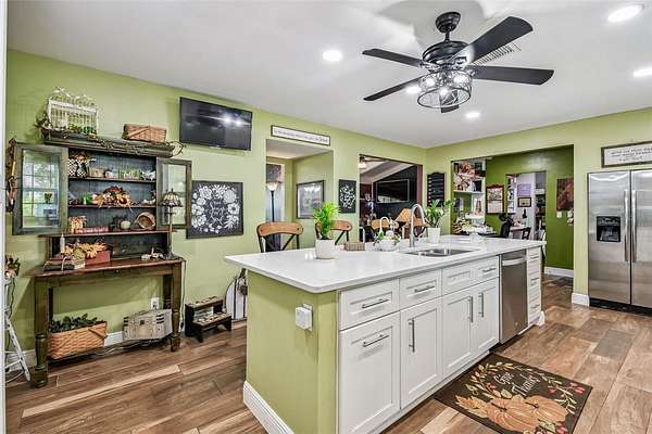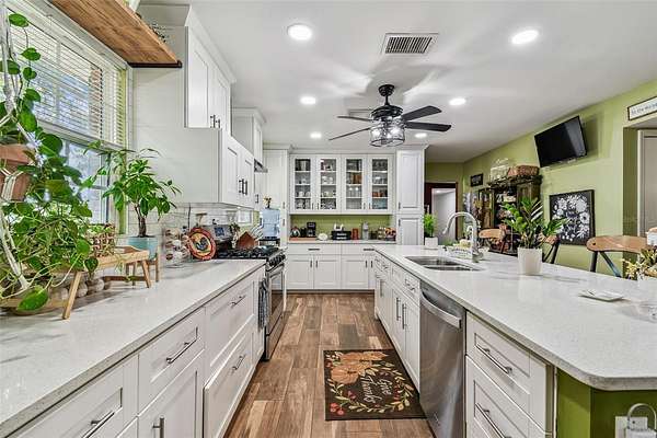 Moving on to the spacious & stylish interior, the inside boasts 3,600 sq. ft. of thoughtfully designed living space and welcomes you with warmth and character. Highlights include: 5 generously sized bedrooms (including a downstairs owner's suite and guest suite); 3.5 bathrooms for convenience and comfort; A family room with vaulted, exposed-beam ceilings and a cozy wood-burning fireplace; Separate living and dining rooms; a dedicated office nook; and Ample storage with organized closets throughout. The remodeled kitchen is the heart of the home, boasting quartz countertops, soft-close cabinetry with pull-out organization, glass-paneled uppers, and a spacious pantry-ideal for bulk storage.