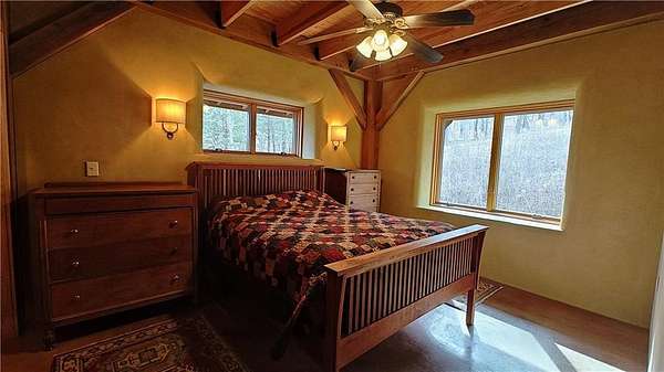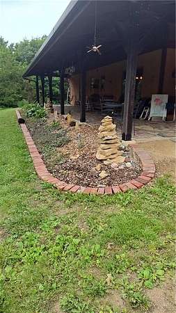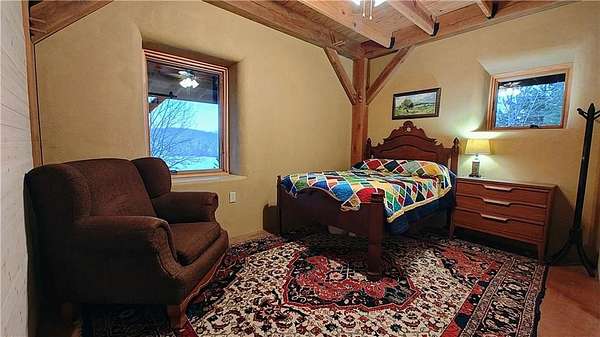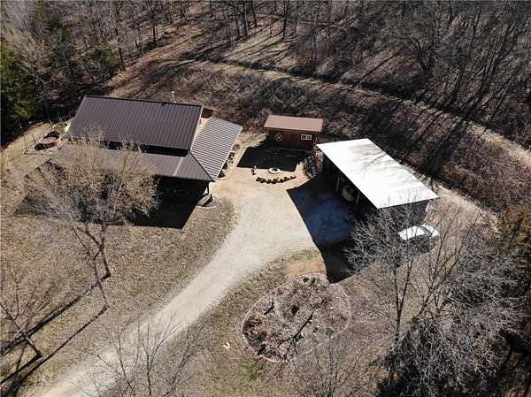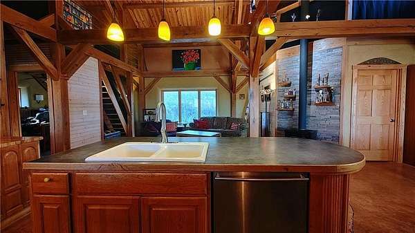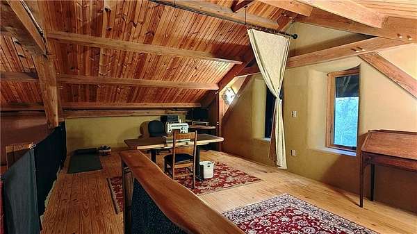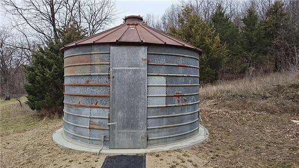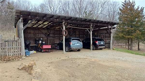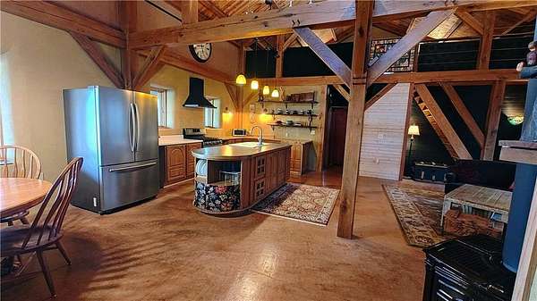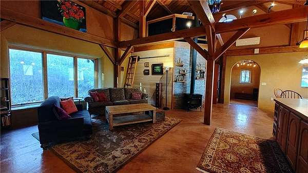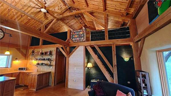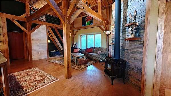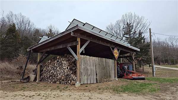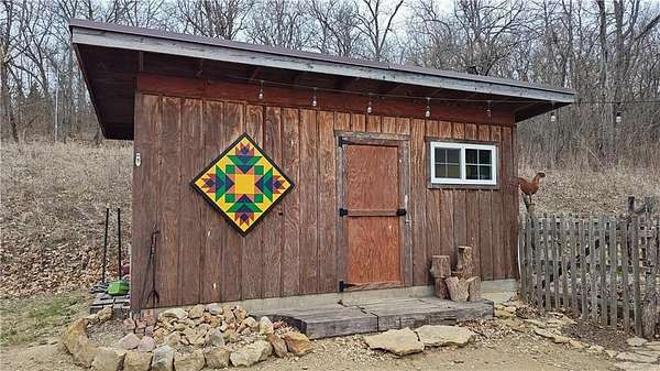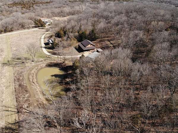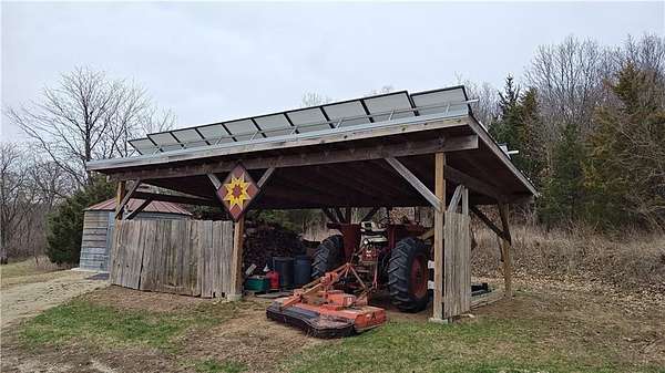 Net-Zero Custom-Built Timber Frame Home on 27+ Private Acres with Stocked Pond Energy Independence, Privacy, Woods, Water, and Pasture - 12 miles from Lawrence: This custom 1,550 sq ft timber-frame home sits 500 feet off the road on 27+ acres overlooking the Buck Creek Valley. Designed for efficiency and built with the highest quality materials, it offers a rare combination of sustainability, recreation, and proximity to town. Durability and comfort are hallmarks of this home. You really must experience this home first-hand! 10 acres fenced pasture (high-tensile 4-wire electric fencing) 17 wooded acres with mature oak, hickory, walnut & hedge and over 1 mile of private hiking trails Stocked largemouth bass pond Pond aeration system installed 2025 Home positioned halfway up the hill for protection and views The Home: 1,550 sq ft PLUS 500 sq ft covered porch Traditional timber-frame construction (white oak) 2 bedrooms + flexible loft space (office/guest/yoga/studio) 20' ceiling peak in open living area Large kitchen with island Zero-entry walk-in shower Straw bale exterior walls (R-40) Structural insulated panel roof (R-40) Andersen casement windows Standing-seam metal roof Mitsubishi mini-split heat pump (new coil 2025) Pacific Energy Alderlea wood stove Complete architectural plans available Natural materials create exceptional indoor air quality and a calm, grounded feel Net-Zero Solar Energy: Installed in 2018 Produces 8,500-9,000 kWh annually, historically exceeds total household usage Inverter replaced March 2024 Average historical electric bill: $54 Water & Infrastructure 8,000-gallon rainwater cistern Pump house/workshop Whole-house filtration system (spin-down, carbon/sediment, UV, optional chlorinator) Outbuildings 11' x 18' workshop / pumphouse 15' x 45' pole barn (3 bays) 16' x 32' pole barn (2 bays) Converted 15' diam. grain bin with concrete floor, electricity, lighting & exhaust fan