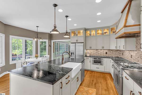 Live Elevated at The Cliffs at Glassy - 34 Eagle Rock Rd Perched high above the clouds, 34 Eagle Rock Rd invites you to experience life at a higher altitude--where every day begins and ends with a panoramic view that never gets old. Situated on approximately 1.6 acres, this property offers privacy and space, while still providing a small, easy-to-maintain yard--complete with a fenced area perfect for your two-legged or four-legged family members. Just beyond this fenced portion in perfect view of the sprawling main deck, a serene rock waterfall and koi pond bring a touch of zen to your backyard--nature's soundtrack included. This thoughtfully updated mountain home blends classic charm with modern luxury. The heart of the home is the newly remodeled kitchen--featuring rich soapstone countertops, custom floor-to-ceiling cabinetry, a pot filler for your inner chef, and a wine chiller to keep the good times flowing. All bathrooms have been beautifully updated, including the spa-worthy primary bath with a large tile shower and deep soaking tub--the perfect way to unwind after a long day on the trails or the links. Tucked away on the upper level, the primary suite is a true retreat with its own private balcony. Step out with your morning coffee--or your evening cocktail--and take in sweeping views that stretch for miles. It's your own personal perch in the clouds. The only thing missing? A private coffee or wine bar--and there's plenty of space to create one for added convenience and indulgence, just steps from your bed, bathroom & balcony. Need a space to create, dream, or organize your next big project? This home also features a brilliantly appointed creative space--floor-to-ceiling illuminated cabinetry, a concrete work surface, and inspiration built right in. Whether you're crafting, wrapping, or building your next passion project, this space is thoughtfully designed to be both practical and elevated. Not every room needs to be what it looks like today--and this home is full of opportunity to personalize your space: That "TV room"? Imagine it as a stylish home office--just add glass transoms and doors for privacy, and you've got the perfect blend of focus and flow. The sunroom? Add custom window seats and it becomes your cozy reading nook--whether you're team hardback or Kindle, the mountain light is just right. Need a family command center? The sunroom's natural light and scenic views also make it ideal for a well-organized workspace, homework hub, or planning zone. And upstairs? The unfinished attic offers a golden opportunity to expand your heated square footage without adding to the roofline or foundation. Think studio, bunk room, or just bonus space to dream up. Finally, let's not forget the 3-car garage provides plenty of space for vehicles, storage, or even a workshop--perfect for hobbyists or those needing room to spread out. It's not just a place to live--it's a place to breathe. One filled with crisp mountain air, luxury finishes, and the unmatched serenity that only The Cliffs at Glassy can offer. Come for the view. Stay for everything else. Private showings available through Keia Prior (864-387-0904) by appointment - book your private tour today.