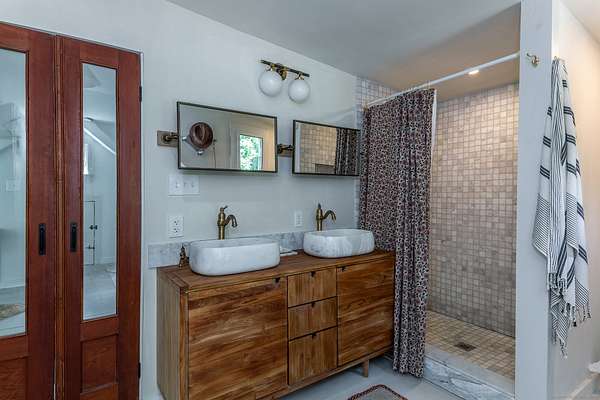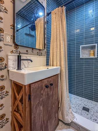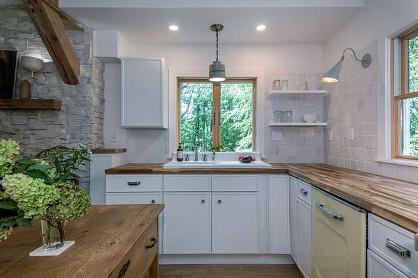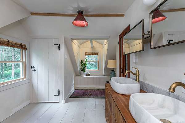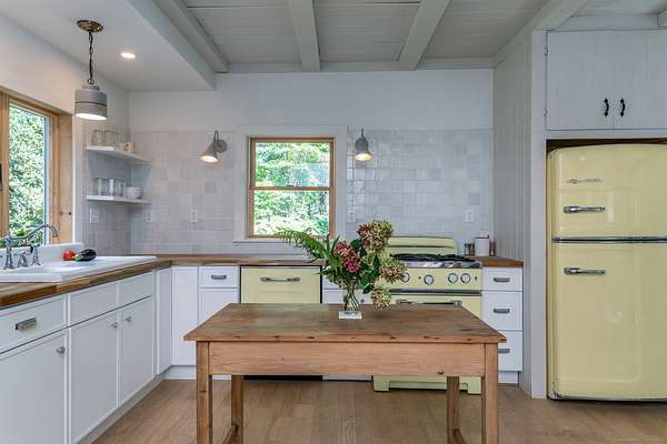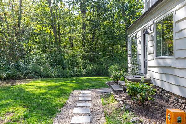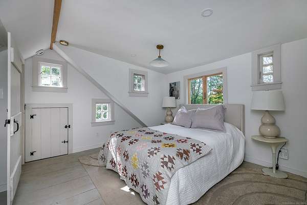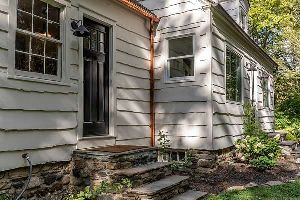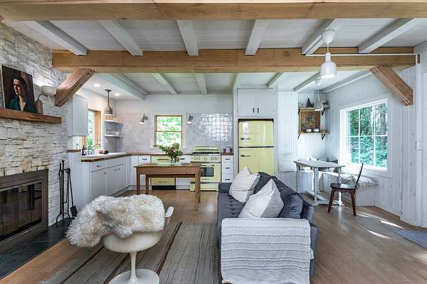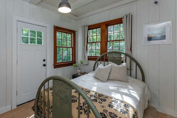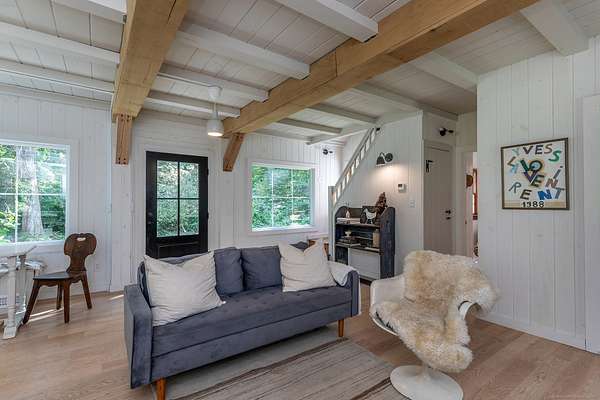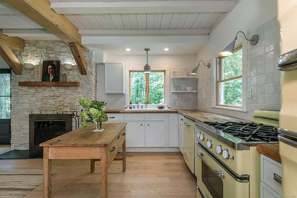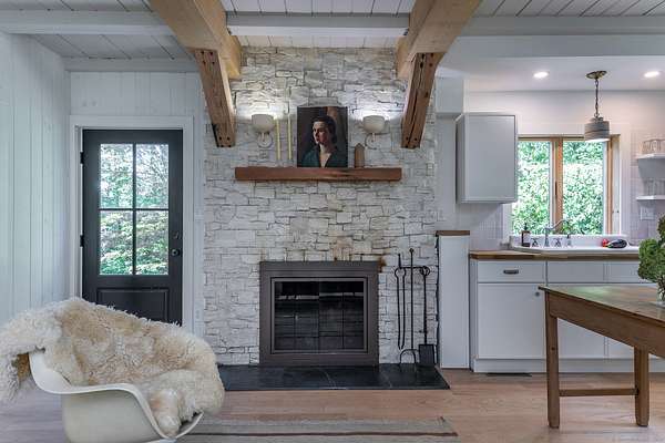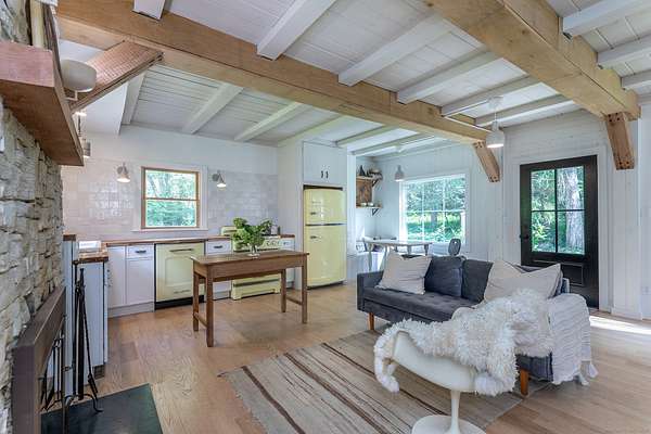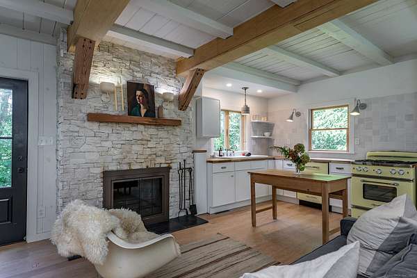Uber Chic Country Cottage on 5+/- private acres. Completely and meticulously renovated with all new: HVAC (including new owned propane tanks), plumbing, electric, insulation, doors, and windows with some historic exceptions and brand new roof. 4-Bedroom Septic. Open living/dining/kitchen with wood-burning fireplace, beams and new 5" oak floors lead to a terrace with a fieldstone fireplace & grill overlooking a level lawn. Kitchen with new 1940s retro appliances. First floor bedroom with cedar closet and private outdoor access. Full first floor bath. Upstairs, charming ensuite primary with pine floors and an adorable alcove for reading or sleeping. Potential building site for larger main residence. Private road. The perfect getaway. Must see!