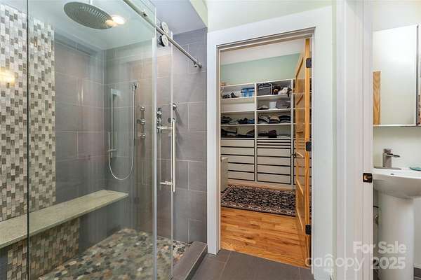 The main-level primary suite offers sophistication and convenience with direct access to a private covered deck and large hot tub, where you can unwind beneath the stars. Inside, the spa-inspired bath features heated floors, a Jason hydrotherapy tub, spacious tiled shower with stone seating, and a private water closet with its own sink.