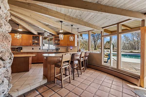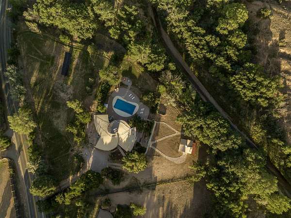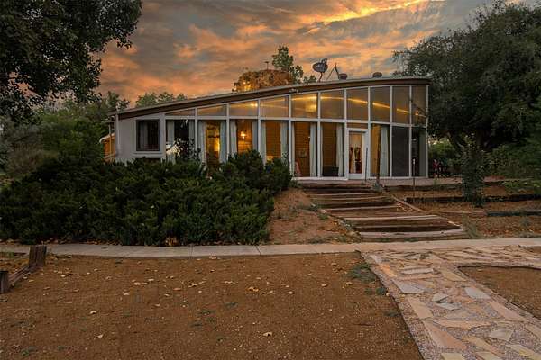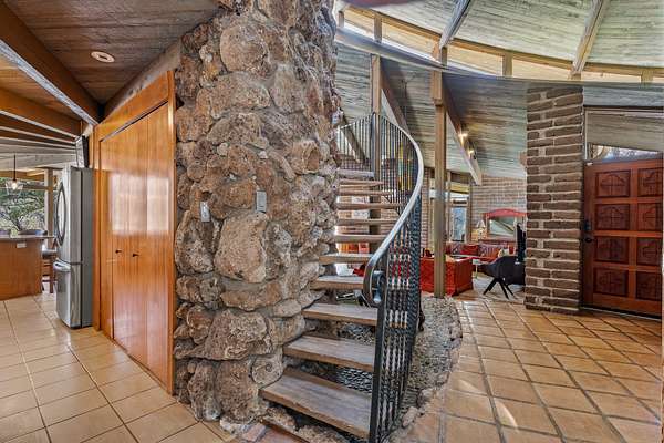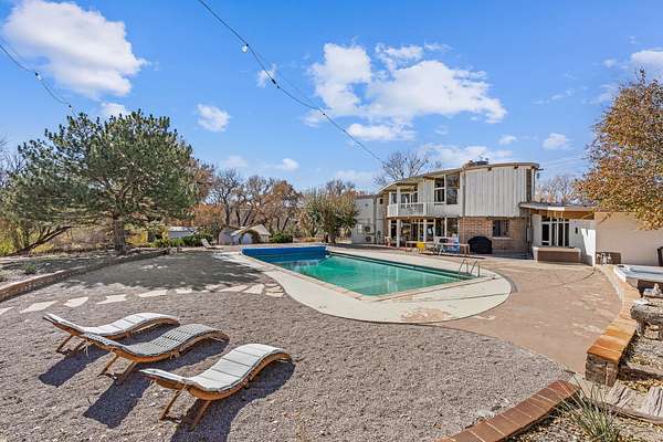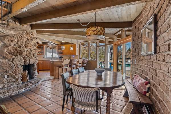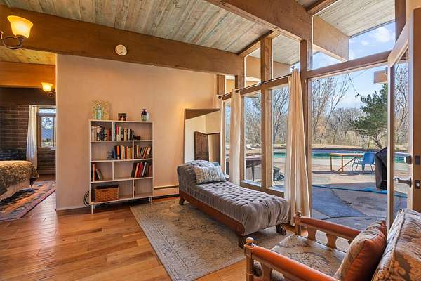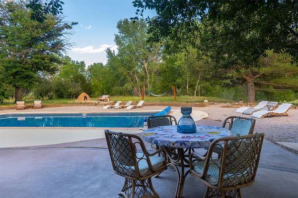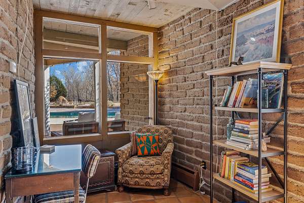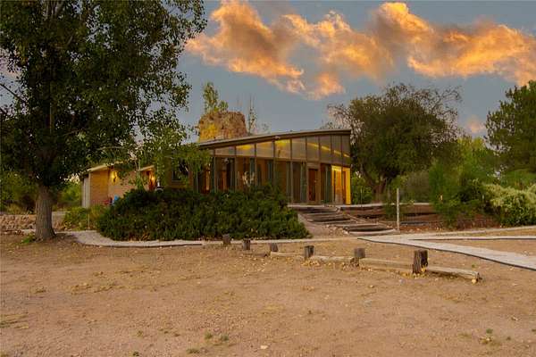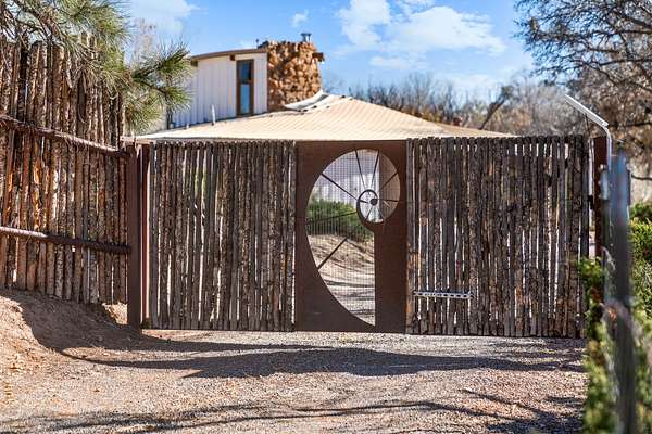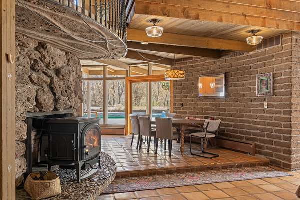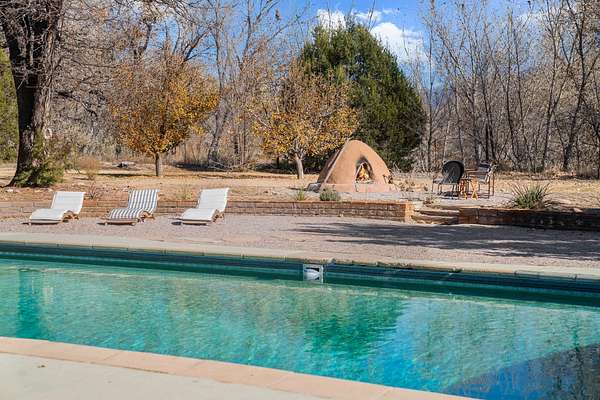 El Caracol Court | 34 State Road 503 is a truly distinctive riverfront property located along the Rio Nambe in the lush Nambe Valley. Designed by renowned local architect Allen L. McNown, a University of Oregon trained architect who settled in Pojoaque in the 1950s and became known for his contemporary adobe work with undulating forms and tinted-light interiors, including the modern church at Nambe Pueblo. The home combines artistic design, functionality, and nature in an extraordinary way. Its form is inspired by the spiral geometry of a nautilus shell, a motif McNown used in other celebrated "snail" houses in the valley, and this architectural concept defines a flowing interior that celebrates light, water, and organic space. Set on approximately 2.10 acres, the property is fully fenced and offers both privacy and usability. It benefits from surface water rights off the Rio Nambe as well as a shared well, providing flexibility for landscaping and irrigation. The grounds include mature trees, gardens, a swimming pool, storage shed, and a separate workshop-a combination rarely found in this corridor.The residence itself measures roughly 4,000 square feet with three bedrooms and three bathrooms. Key design features include adobe and frame construction, dramatic curving walls, exposed wood beams, a lava-rock fireplace, and a sweeping staircase that centers the home's open plan. Additional amenities include: 40' Private swimming pool with adjacent lounge area, covered portal, sunroom with glass enclosure, solar improvements, mechanical system updates, maintained roof and gutters, radon mitigation system, updated appliances, and enhanced irrigation infrastructure. Exceptional maintenance and stewardship, upgrades over recent years that have modernized systems while preserving the artistic integrity of the home. The property has also been operated as a short-term rental, generating consistent income and showing strong demand as a retreat or vacation destination.