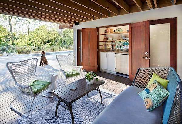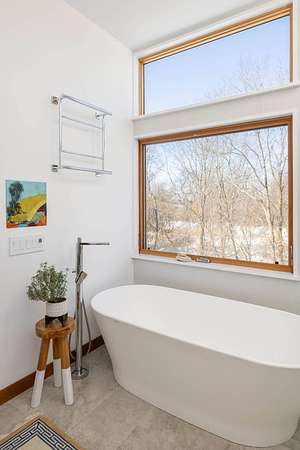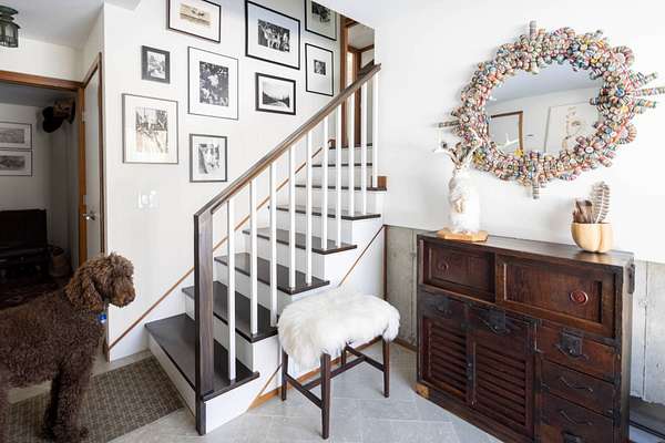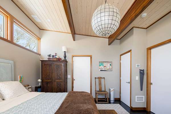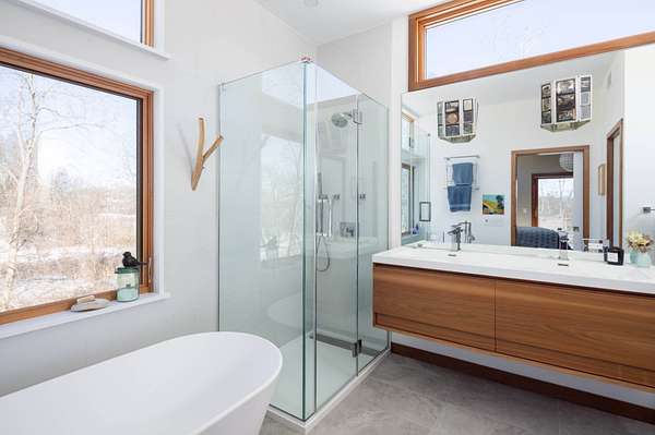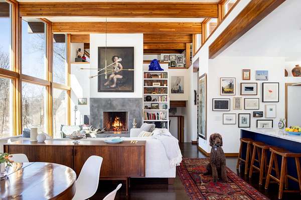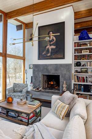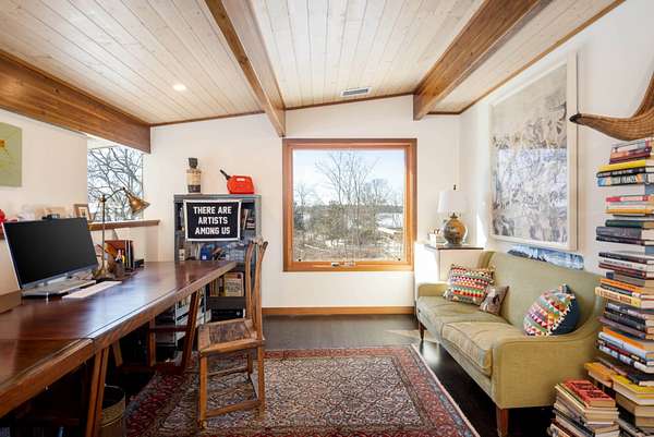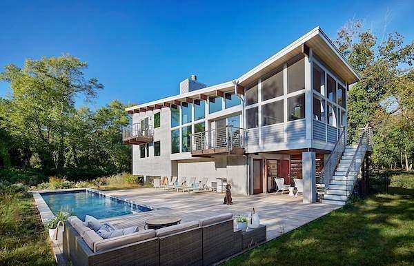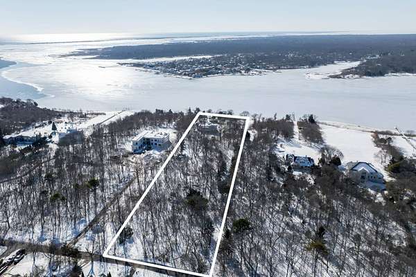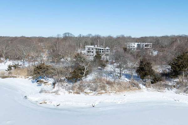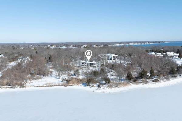 Set on four private acres of wooded, waterfront land once part of the 100-acre Masury Estate known as Beaurivage ("Beautiful Shore"), 34 Old Neck Road South in Center Moriches honors its history and natural setting while embracing contemporary design and eco-friendly building practices. Reached by a 19th c. allee of Linden trees, the approach is a quiet and dramatic introduction to the 2020 Lindal-designed residence beyond. The ground level entry foyer provides access to the garage, mudroom and generous storage areas before leading upstairs to the home's primary living level. There, expansive floor-to-ceiling windows, wood beams, and clerestory windows define the great room creating a seamless connection to the natural landscape, water and wildlife throughout the seasons.The spacious eat-in kitchen, complete with pantry and adjacent laundry room, balances everyday functionality with thoughtful design. Whether preparing a simple meal or hosting a larger gathering, the layout supports both with ease, efficiency and style. A large cast cement fireplace anchors the great room living and dining spaces with adjoining balcony and flows to the outdoors via triple sliding glass doors to a screened-in porch. A second fireplace there enables enjoyment of fresh air and ocean breezes well into the cooler months. Just off the living room and kitchen, a den provides additional flexible space for reading or relaxing. Two guest bedrooms, each with en suite baths, offer nature views along with privacy and separation from the main living areas. The top floor primary suite provides a private retreat with its own en suite bath and large walk-in closet. A balcony creates a treehouse-like vantage point overlooking the wooded setting and Moriches Bay beyond. A loft open to the living space below offers additional flexibility, ideal for a home office or secondary sitting area. Outdoors a large Ipe deck features a heated saltwater pool (with automatic cover), cabana, wet bar and changing room to enhance summer living and entertaining. A winding path leads from the backyard to two natural beaches, providing direct water access and a peaceful setting for dining, reading or reflection. For canine residents, the property offers two acres of wooded area for roaming protected by invisible fence. Built to be FEMA compliant, and engineered to meet current floodplain standards, this home offers both peace of mind and long-term resilience in this waterfront setting. 47 solar panels and 3 heat pump powered HVAC zones further enhance efficiency, reducing operating costs while supporting a more sustainable way of living for this 100% electric-powered home. Center Moriches has long been appreciated as a waterfront destination, once home to a collection of Gilded Age estates and bayfront hotels that drew visitors seeking escape from city life. Today, this private waterfront retreat offers a unique opportunity to continue that tradition in a high-quality, recently built home for year-round delight.