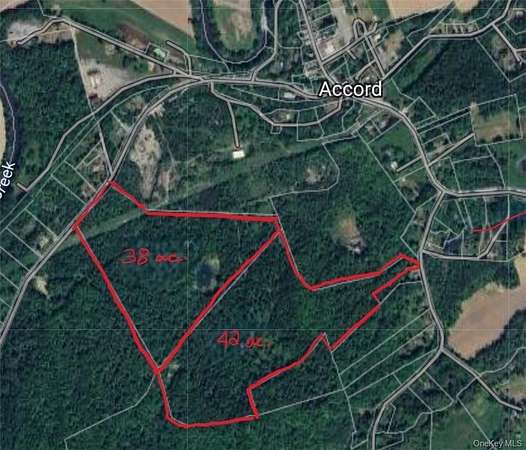 These 80 acres of prime mountain-view property are located in one of the most desirable areas in the Hudson Valley, Accord, N.Y. This is the perfect setting for executive estates, family compound or a resort/boutique inn. Positioned just west of the Mohonk Mountain House, set on the highest elevation between the Catskill and Shawangunk mountains, the property offers sweeping views of both mountain ranges from a multitude of possible building sites. The property is rolling and gently sloped sitting atop Ulster County's largest producing freshwater aquifer. Mature and young growth forest surround grassy openings which are all connected by roadway paths that suggest many options within a developmental design. A complete architect's dreamland. There is also a large spring fed swimming area for cooling summer swims and frosty fire-lit winter skating. This is a true nature paradise in a perfect location with spectacular views and favorable Hamlet District Zoning (1 acre minimum per dwelling unit and commercial business allowed). This property offers an unequalled opportunity of investment in the best of living and experiences in the Hudson Valley. Parcels 76.2-3-8.117 is 42+ acres & 76.2-3-8.115 is 38+ acres.