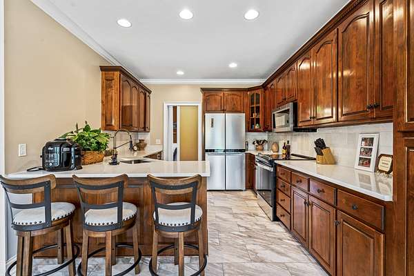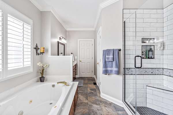 - Bathroom Mirror(s), Breakfast Bar, Built-In Features, Crown Molding, Double Closets, Eat-In Kitchen, High Ceilings, High Speed Internet, Primary Downstairs, Soaking Tub, Split Bedrooms, Walk-In Closet(s), Walk-In Shower