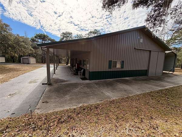 As you enter through the beautiful front door you'll be captivated by the grandeur of the vaulted wood ceilings in the expansive living area, and a rustic, natural stone fireplace and central focal point of an in-ground heated pool. The home is just over 2,500 sq ft with a split plan that provides natural light and a flow that gives a cozy and open ambiance. The home boasts three bedrooms, 2 bathrooms plus a FLEX/BONUS room. The large master suite features a regal tray ceiling, it's own luxurious bathroom with walk-in shower, and a separate relaxing jacuzzi tub, 2 expansive walk-in closets that provide ample storage as well..BUT WAIT, there's more...the owners suite also includes a hallway that leads to a separate sitting room perfect for nursery or cardio or TV room. Step outside from your home owner suite or from the living area to the screened-in lanai, where you can unwind overlooking the in-ground heated pool, perfect for year-round enjoyment. The property is fully fenced for privacy, including a designated area for your pets. In addition, there are 2 work sheds and an RV carport that offer extra storage and workspace, along with a massive 42x60 Morton built garage, complete with multiple garage doors, making it ideal for car enthusiasts or additional storage. Could easily be converted to a barn for horse or animal enthusiasts, NO HOA, NO DEED Restrictions, animals okay. HOBBY farm etc okay. Property is HIGH and DRY, no flood insurance required, Roof & Pool solar done in 2020. Located in highly desirable and convenient location, close proximity to all shopping conveniences and necessary medical facilities. Property is centrally located 5-10 min from both N Veterans Expressway connector off Norvell Bryant and S connection off HWY 44. This property truly combines luxury living with practical features, making it a rare find that you won't want to miss. Schedule a showing today and explore the potential of making this incredible home yours!