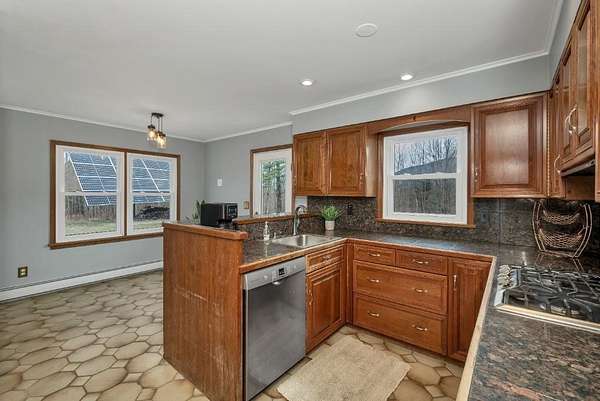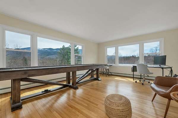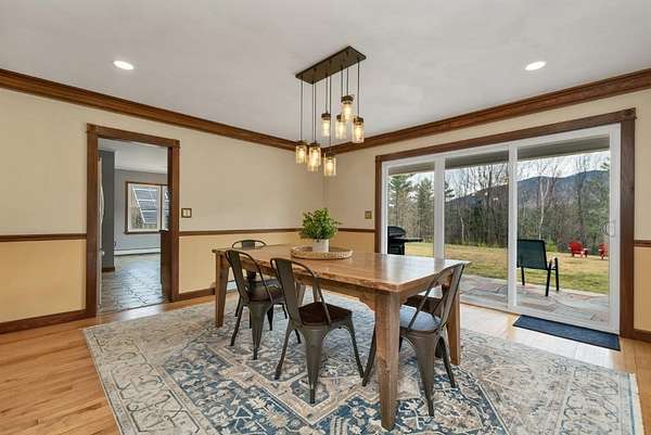 Welcome to your mountain sanctuary! Perched on 2.3 private acres, the property boasts a level yard ideal for gardening, entertaining, outdoor gatherings, or simply soaking in the sweeping mountain views of North Peak and Cannon Mountain. Step inside to discover an oversized mudroom complete with a dedicated ski waxing area, perfect for storing and maintaining all your seasonal gear. The eat-in kitchen features custom cabinetry, a gas cooktop, and generous prep space for the chef in the family. Throughout the home, hardwood floors, custom crown molding, and detailed trim work add warmth and elegance. The spacious dining area showcases stunning backyard and mountain views, with direct access to the patio, an ideal setting for summer meals under the stars. A cozy sitting area with exposed wood beams and a wood burning stove creates the perfect retreat after a day of skiing or hiking. For larger gatherings, the expansive living room is filled with natural light, offering ample space for entertaining, movie nights, or relaxing with family and friends. A versatile bonus room on the main level can serve as a home office or playroom, while the large primary suite provides a peaceful escape, complete with a double vanity and spacious walk-in shower. A half bathroom completes the first floor. Upstairs, you'll find 3 generously sized bedrooms, each offering picturesque views, along with an updated full bathroom. There is a large basement with a half bathroom, two cedar closets, with the potential to be finished adding to your living space. Located just minutes from outdoor adventure and local attractions, including Cannon Mountain and Echo Lake, as well as snowmobile trails, charming local shops, restaurants, and hiking. This home delivers the ultimate blend of serene mountain living and modern convenience. Welcome to 340 Sugar Hill Road!