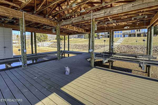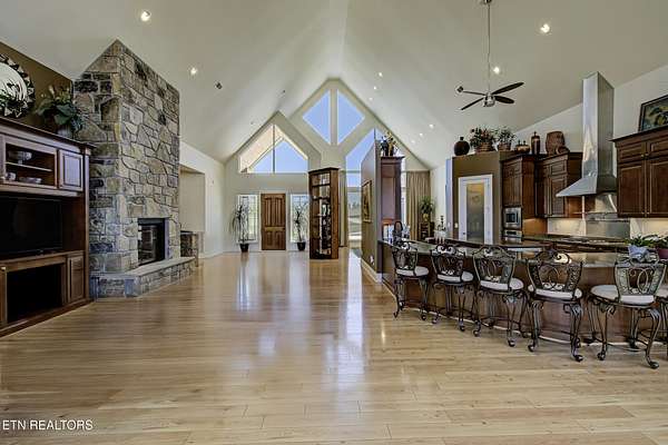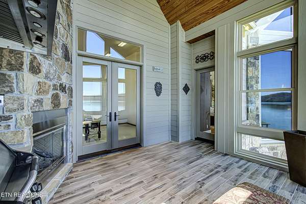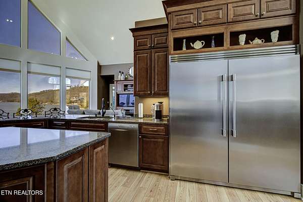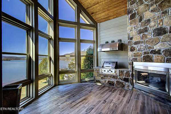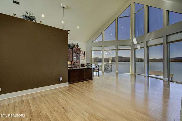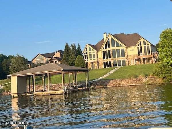 HUGE Price Reduction. Nestled in the prestigious Grande Vista Bay community, this exceptional 142 ft of deep waterfront home offers panoramic views of Watts Bar Lake on the Tennessee river and views of the untouched and protected Thief Neck Island, perfectly positioned to capture stunning sunsets. This estate is sitting on 1.29 acres and the lot next door can be purchased separately. Spanning 6,300 sq. ft., the open-concept layout with many custom design details. With floor to ceiling windows all along the back you have the great room, breakfast area and kitchen all looking out on the lake. The primary suite is an incredible space with private access to a wonderful morning porch, floor to ceiling windows have been designed for lake living, 2 walk-in custom closets offer so much space for all your clothing with double racks, The attached bath is one that dreams are made of with an oversized walk-in seated shower with glass block, or step in the heated jacuzzi tub, dual vanities with a makeup vanity along with heated floors. Soaring Ceilings in the great room area with stone fireplace and built in TV cabinet is a great place to watch your favorite show or your current read while enjoying the view. An attached enclosed sunroom is perfect for overflow with gas fireplace and a gas grill. The kitchen is seamlessly attached to the great room and is a true Chefs Kitchen made for easy entertaining with a Wolf 5 burner gas cook top, warming drawer, full refrigerator and full freezer, wall oven along with a microwave. You have plenty of storage. A large island allows space for food preparation also has a walk-in pantry. Open a bottle of champagne from your wine fridge while you wait for dinner. The large breakfast counter seats 6 and there is room to put a table if you would rather sit and look out at the lake. Formal dining area also has floor to ceiling windows what a great place to dine with family and friends. Home office is bright with the large window and 2 built in bookcases with French doors for privacy. Another bedroom is on this level with bath and access to the enclosed porch, it was converted into a pottery studio and is easily converted back. Hall half bath is great for company. Laundry room with quartz counter tops for your sewing or craft projects and a mud room complete this level. Upper level is a full bonus, or another office or use your imagination to convert it into a space just for you with a full walk-in attic for great storage. Make your way down the stone staircase to the huge Family/recreation room with built ins and full bank of windows to watch the activities on the lake and you can make your way outside to the stone patio a large firepit area or when the water is calling, mere steps away, this covered dock with lifts for boat and wave runners is where you can offer a sunset water cruise after a long day of play. Back inside are 3 large bedrooms, a Jack and Jill bath along with a hall bath makes this home so easy to bring everyone home for the holidays. Another laundry on this level and a very large unfinished storage area with outside access and all your equipment and more storage. With the main level attached 3 car garage with finished flooring and outside access to your fenced garden area to create and grow what you love. Your luxury escape awaits, close to everything within 7 miles but is away from it all in this active community where you can even boat to the Gulf There is a $160 GVBPOA Account Set Up Fee to Buyer at closing.