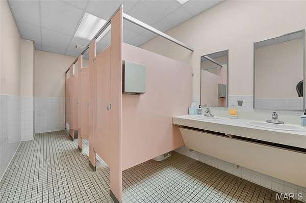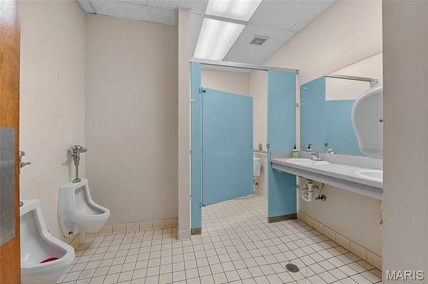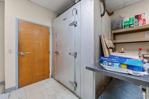 The property includes a functional kitchen equipped with a gas stove, 3-bay sink, and walk-in cooler. Additional features include a private office, four restrooms totaling seven stalls and four urinals, and a security system for added peace of mind.