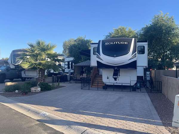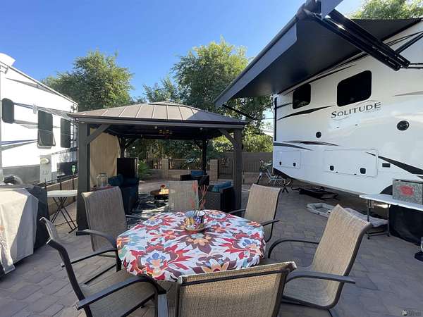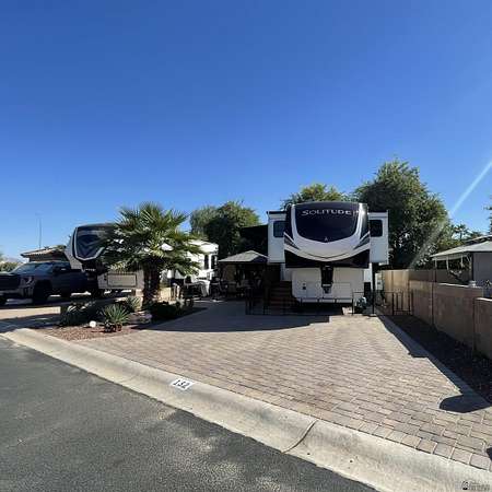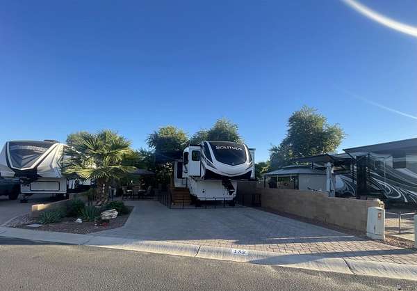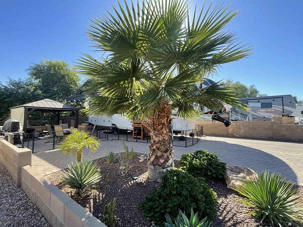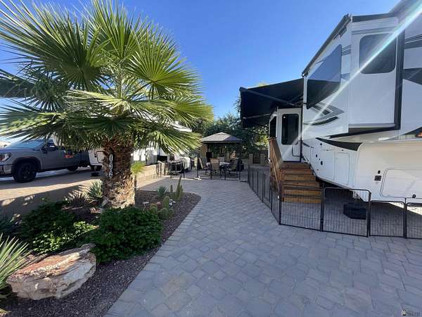 Est $504/moThis could be your everyday--a perfect blend of relaxation and outdoor living. Nestled in a quiet and private setting, this beautifully landscaped North facing RV lot features a paved patio area and solid surface for RV tires to rest on along with a gazebo that provides plenty of shade and comfort, making it ideal for unwinding or entertaining. Both sides and back of lot are fenced with 15' of PAL area between you and your neighbor behind you. Located in 55+ gated community offering season planned events, concerts, classes & cafe/cabana.