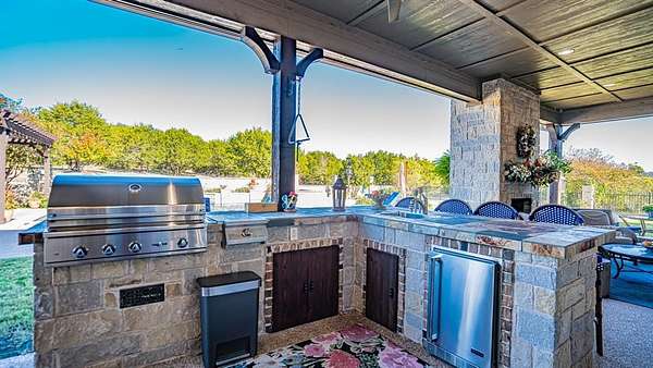 - Attached Grill, Balcony, Covered Patio/Porch, Fence, Gas Grill, Lighting, Outdoor Grill, Outdoor Living Center, Rain Gutters