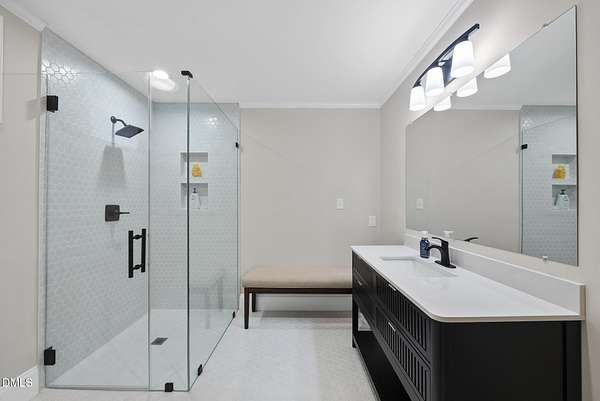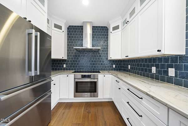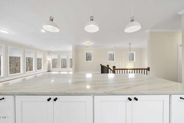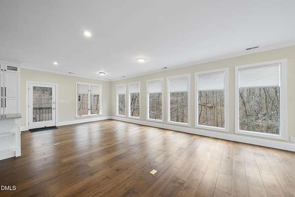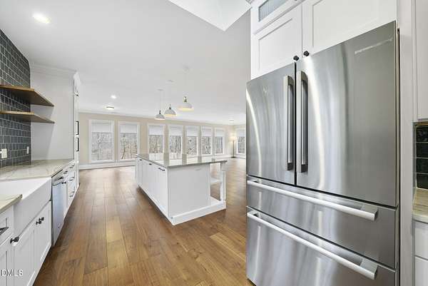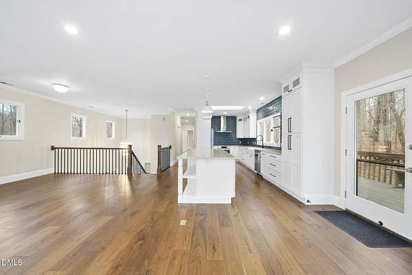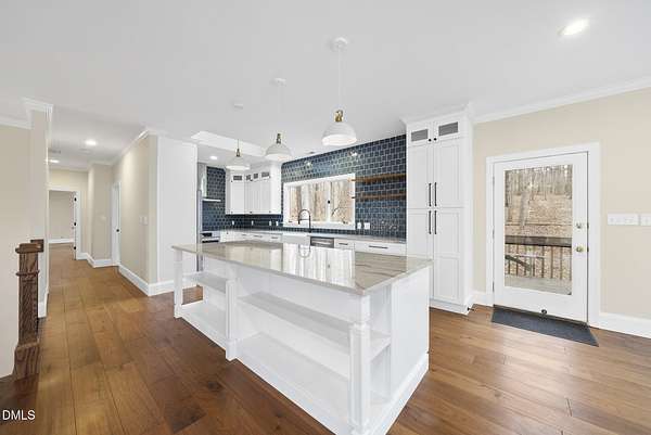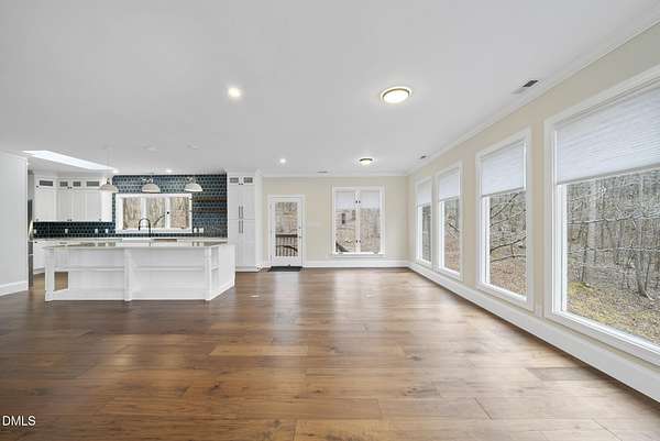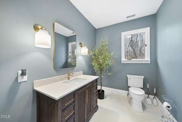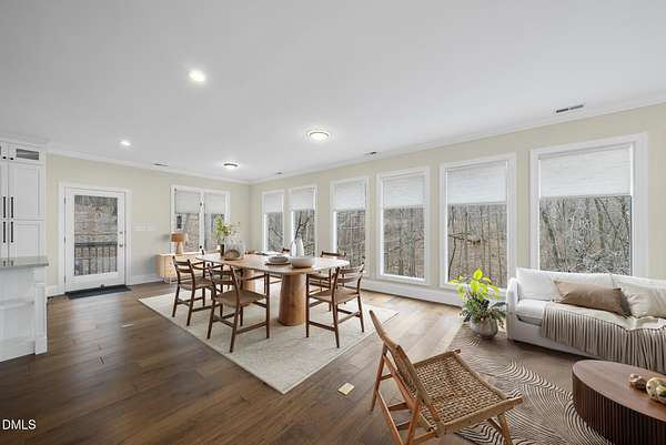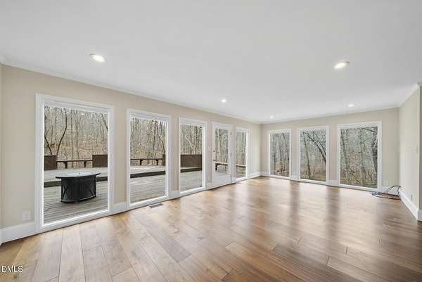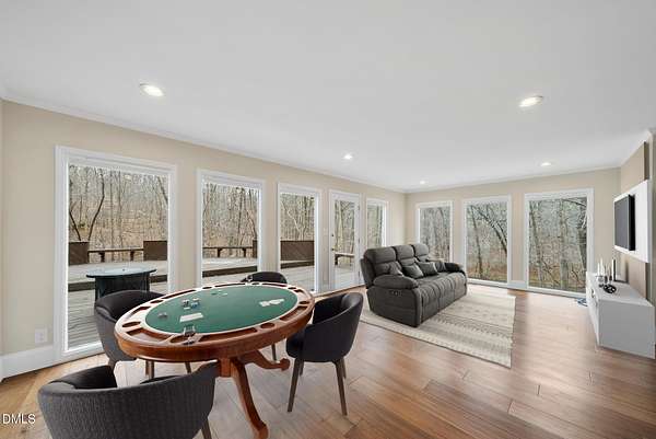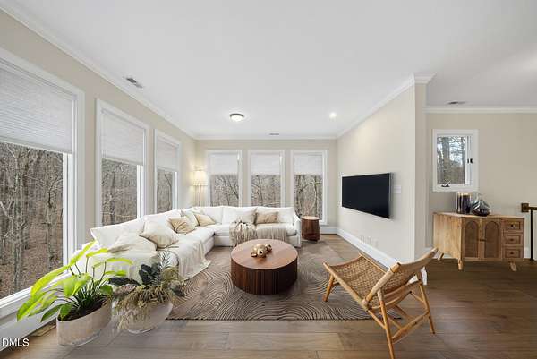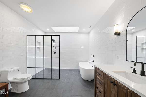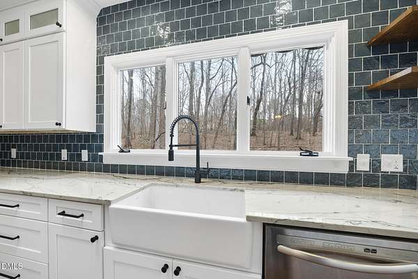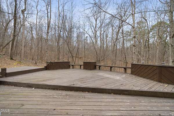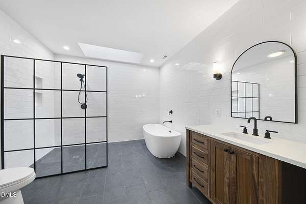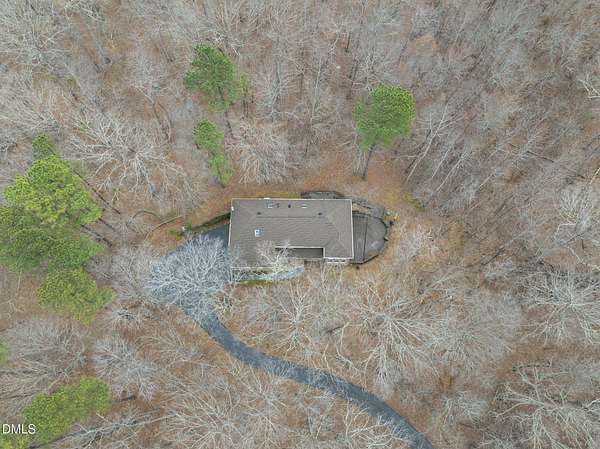 Fully renovated luxury home on 5 private wooded acres with a peaceful pond near historic downtown Hillsborough. Recently renovated throughout, this exceptional property blends modern design, high-end finishes, and tranquil natural surroundings. The light-filled interior features dramatic walls of windows overlooking the surrounding hardwood forest, creating a seamless connection between indoor living and the natural landscape. The open main living areas flow effortlessly to an expansive multi-level deck, ideal for entertaining or enjoying the peaceful setting. The fully renovated kitchen blends modern design with high-end functionality, featuring quartz countertops, custom cabinetry, and a dramatic full-height handcrafted tile backsplash. A Bosch induction cooktop paired with a Bosch stainless steel vent hood anchors the cooking area, while the apron-front farmhouse sink with commercial-style pull-down faucet and matte black plumbing fixtures adds both elegance and performance. A large picture window above the sink frames views of the wooded property. The spa-inspired primary bathroom offers a true retreat, featuring a freestanding soaking tub, oversized walk-in shower with dramatic black steel grid enclosure, floor-to-ceiling tile, slate-style flooring, and a skylight that fills the space with natural light. A custom wood vanity with quartz countertops and designer matte black fixtures adds warmth and sophistication. Outside, the property unfolds across 5 secluded wooded acres featuring a private pond, mature hardwood trees, and a long winding driveway that enhances the home's sense of privacy and arrival. The expansive outdoor living spaces and serene landscape create a peaceful retreat rarely found this close to town. Conveniently located just minutes from downtown Hillsborough's restaurants, breweries, Riverwalk trails, and historic district, with easy access to Durham, Chapel Hill, Duke University, UNC-Chapel Hill, Research Triangle Park (RTP), and I-40 for commuting throughout the Triangle.