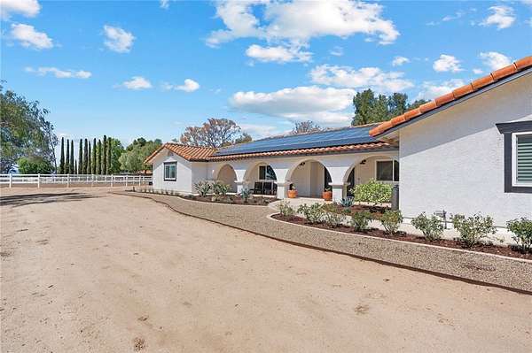 Blanca Rosa -- Prime Temecula wine country location just off Calle Contento & Madera de Playa. This 5-acre property boasts turnkey equestrian facilities in the heart of Southern California's vineyard region, only 15 minutes to the freeway. Horse enthusiasts will appreciate the 8-stall barn with wash racks, feed room, and tack room, plus a 75' x 150' arena, and fenced pastures. Ride direct from the property to nearby wine country riding trails for a fantastic lunch at one of the many award-winning wineries. The beautifully updated 3 bed, 3 bath home blends country warmth with modern updates, featuring bright living spaces, a well-appointed kitchen, comfortable bedrooms, and solar. Recent improvements include new attic insulation and a roof less than 2 years old. From the property, enjoy sweeping views of vineyards, nearby wineries, and snow-capped mountains. Just minutes from Galway Downs & CRC, this rare find combines location, functionality, and privacy for a true wine country equestrian lifestyle.