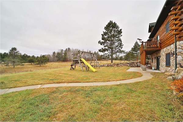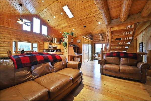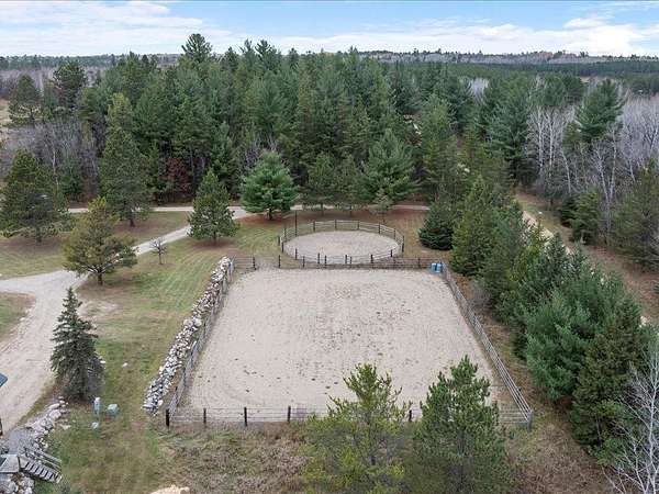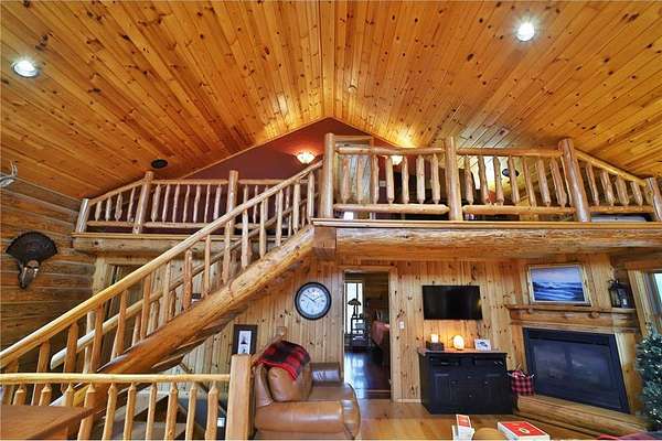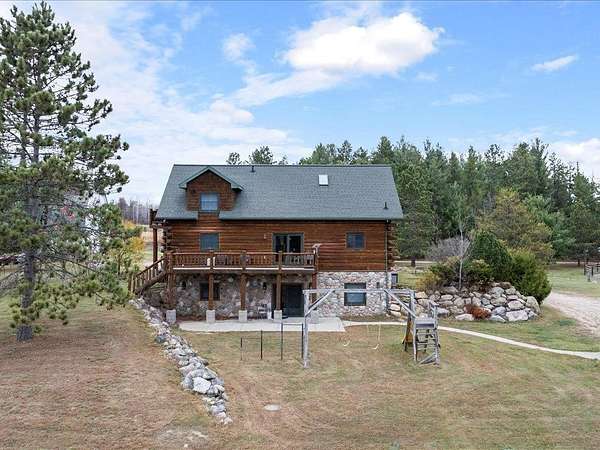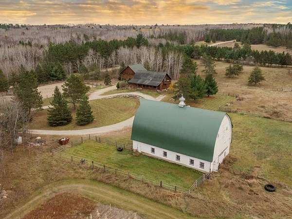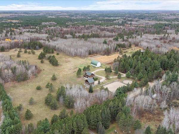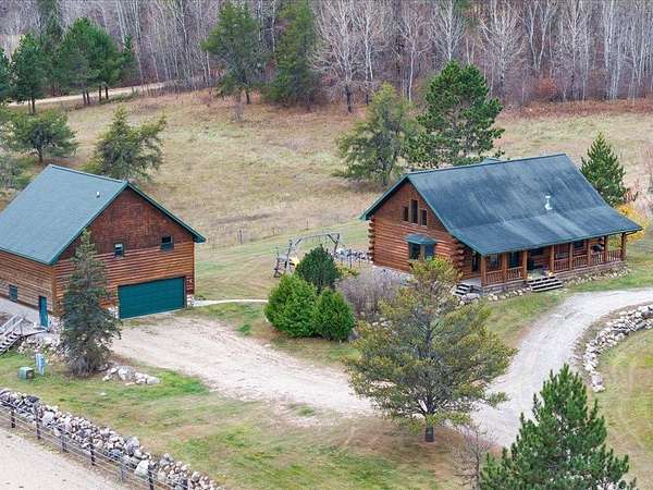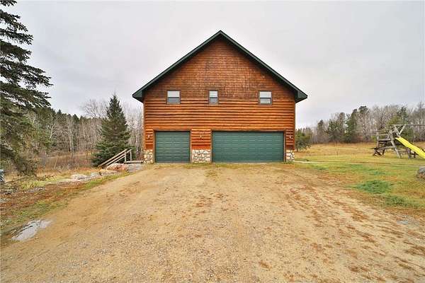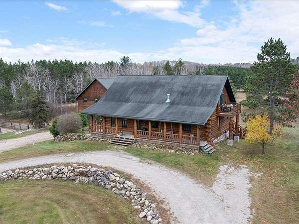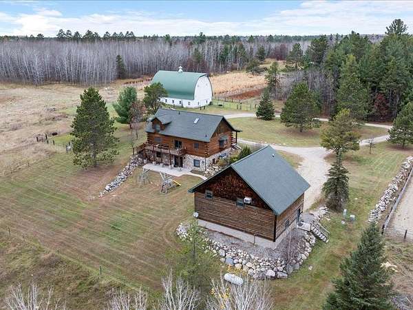 This well-built log home sits on over 10 beautiful acres bordering hundreds of acres of public land ideal for trail riding and hunting. A covered porch welcomes you into the open floor plan featuring vaulted ceilings, a kitchen with custom maple cabinets, stainless steel appliances, granite countertops, and a maple butcher block island. The cozy living room offers a gas fireplace, office nook, and ample storage. The main-level primary bedroom includes a walk-through bath with a jetted tub and tile shower, while log stairs lead to a loft bedroom with a private deck overlooking the pasture and barn. The lower level includes a bedroom, full bath, living area with epoxy floors, laundry, utility room, and private library. The detached garage is split into a heated two-stall section and a single-stall area with stairs to a two-bedroom plus loft apartment. Perfect for a hobby farm, the property includes 10 oak stalls, a tack room, blacksmith shop, hay storage, and a newer steel roof. The land is partially fenced with separate sections, its own well for two self-watering stations, an arena, training area, open pasture, wooded riding trails, and direct access to hundreds of acres of public land for recreation or hunting. The property is conveniently located just 10 minutes from Hackensack and near the Crystal Lake public access--one of central Minnesota's clearest lakes with excellent swimming. Bring your outdoor toys, horses and farm animals and make this awesome property home!