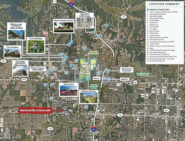 From I-49, take exit 85 for AR-12/SW Regional Airport Blvd. Head east on AR-12 E, which becomes SE 14th St. Turn left onto S Walton Blvd, then right onto SE 34th St. The Bentonville Colonnade will be on your left, at the intersection of SE 34th St and SE Macy Rd.