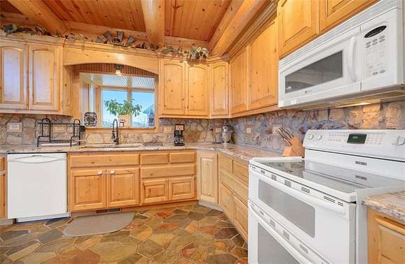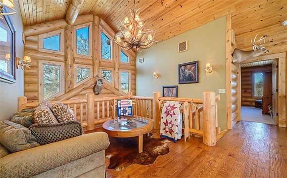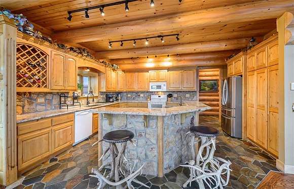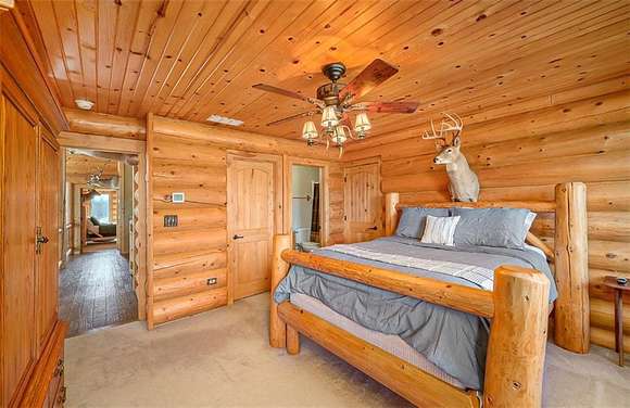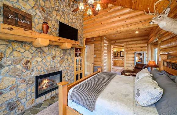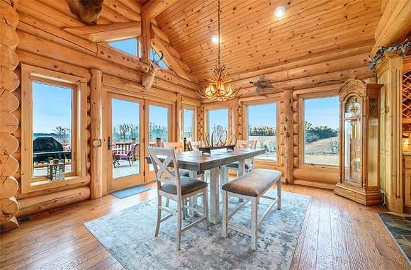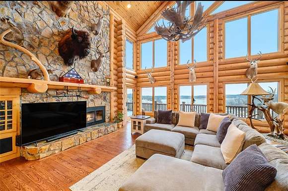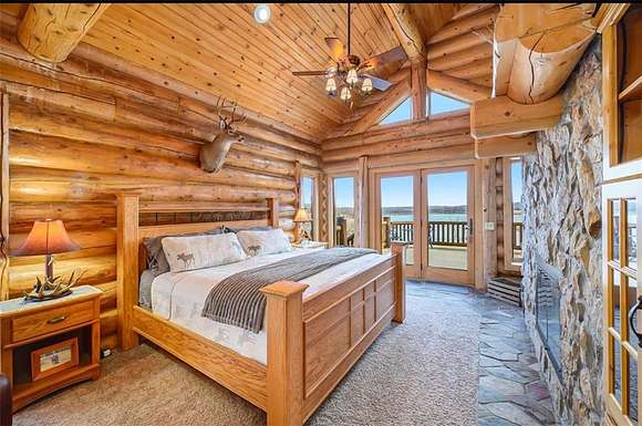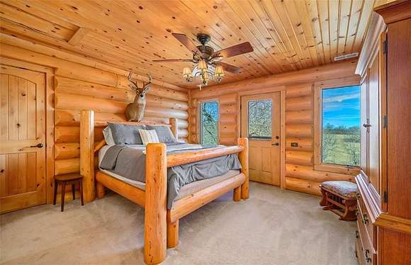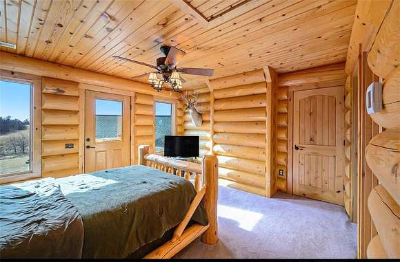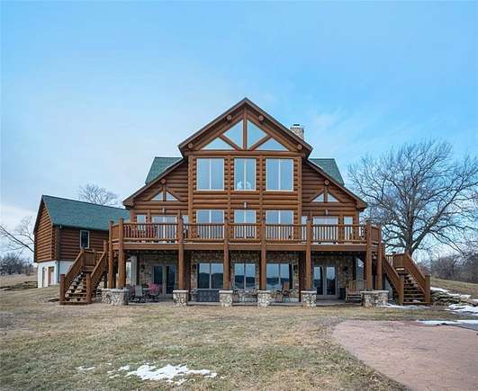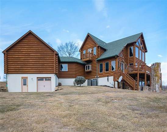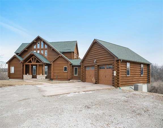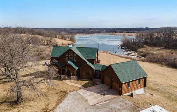 STUNNING CUSTOM LOG HOME located on 130.8 acres (per county records) FULLY FENCED & cross fenced featuring 4 PONDS and a GORGEOUS LAKE!! 40x98 OUTBUILDING & lean to w/solar panels. PASTURE GROUND for your LIVESTOCK & HAY PRODUCTION along with timber. This RURAL RETREAT offers loads of RECREATIONAL OPPORTUNITIES for you and your family! The 4 bedroom 4.5 bath home offers an OPEN PLAN perfect for entertaining! CHEF'S KITCHEN features HUGE ISLAND, granite tops, CUSTOM CABINETS w/roll outs, pantry, dining space & more! SOARING CEILINGS & so many windows to take in the VIEWS! Main level primary suite w/SITTING ROOM & BEAUTIFUL STONE FIREPLACE! Don't miss the spacious laundry and mud room space for convenience. The upper level has 2 SECONDARY BEDROOMS with their own PRIVATE BATHS, walk in closets and balconies. The LOFT SPACE overlooks the EXQUISITE GREAT ROOM, STONE FIREPLACE and WALL OF WINDOWS! Finished walk out LL has the 4th bedroom & full bath, 16x8 SAFE ROOM, bonus room, REC ROOM W/3RD stone fireplace and WET BAR and 2 storage spaces. RELAX and watch the SUNSETS & WILDLIFE from the low maintenance deck overlooking the SALT WATER IN GROUND POOL & LAKE! This is a ONE OF A KIND meticulously maintained property 30 minutes from Kansas City. HURRY!