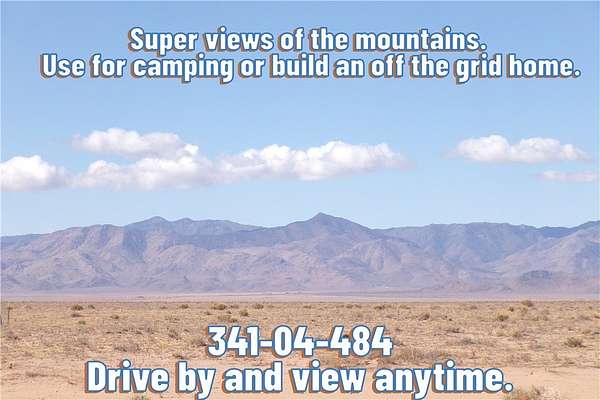 Off the grid property with great mountain views. Nice flat lot that is off the grid. No timeframe for use. No hoa fees or rules. Drive by and view anytime. Use for camping on a long weekend getaway. Many trails in all directions for off-roadings, hiking and horseback riding. No owner financing. Owner/agent.