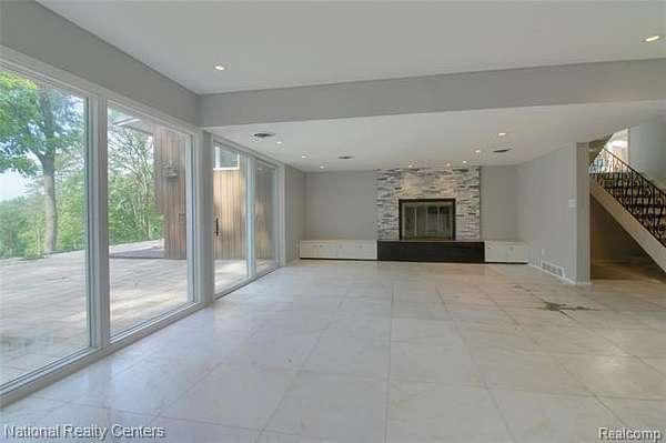 Lower level recreation room with fireplace walks out to an inviting brick patio--perfect for entertaining or relaxing.