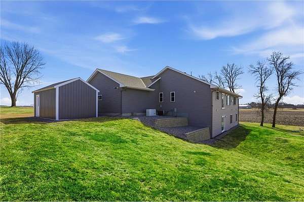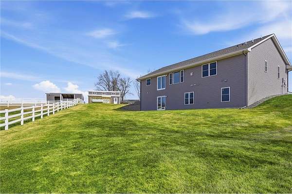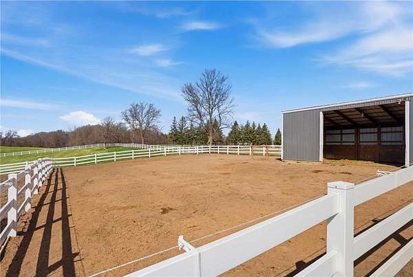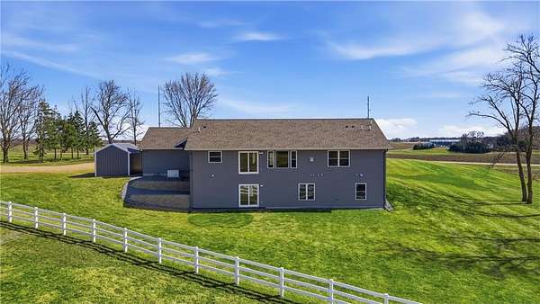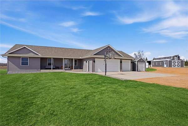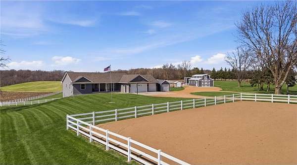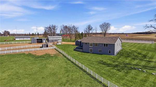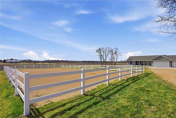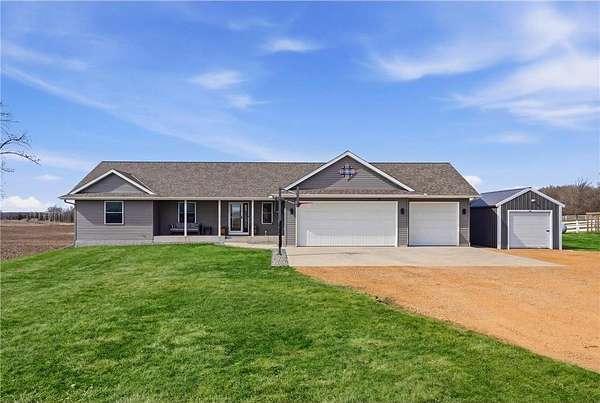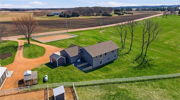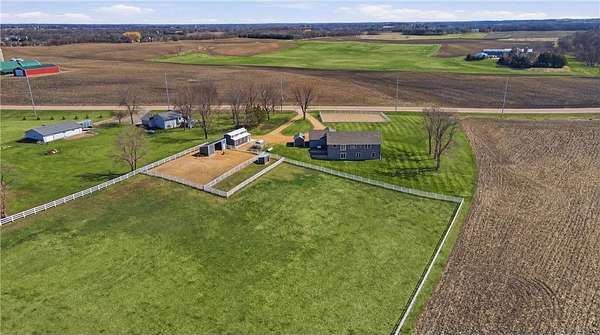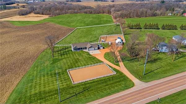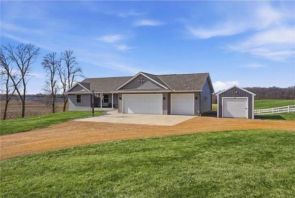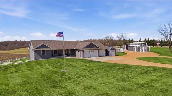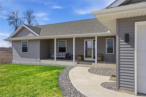 Set among beautiful rolling hills and adjacent to mature woods, 3410 County Road 10 N offers an exceptional opportunity to own a private, scenic homestead just minutes from town with convenient access to amenities. This custom-built rambler sits on almost 4 horse-ready acres and showcases quality craftsmanship and meticulous care throughout. Inside, warm finishes and thoughtful upgrades create a refined yet comfortable atmosphere. The kitchen features granite countertops, custom backsplash, soft-close cabinetry with crown molding, black stainless Samsung appliances, and a gas range. An illuminated island anchors the space, opening seamlessly to the main living area where a tile-surround fireplace, built-in surround sound, and full media setup make entertaining effortless. The primary suite offers a spacious walk-in closet and a beautifully appointed bath with tile walk-in shower and dual vanities. Two additional bedrooms are generously sized, and the functional mudroom with built-in lockers connects to a well-equipped laundry room. Solid maple doors and railings, LVP flooring, brushed oil-rubbed bronze fixtures, and LED lighting add to the home’s elevated feel.