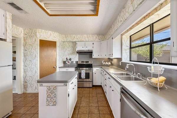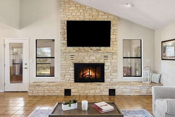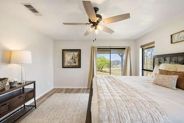 3410 W Ranch Road 152 in Llano offers 5 acres set up for horses with three well-sized pastures, fenced areas, and open ground for riding or grazing. The 2,336 sq ft home includes 3 bedrooms, 2 bathrooms, an open living area with high ceilings, a stone fireplace, and a functional kitchen with bar seating. A long enclosed porch provides additional usable space. The property also features a barn/loafing shed that can be configured for stalls, a feed room attached to the garage, covered trailer parking with 50 and 30 amp hookups, and multiple outbuildings. Mature trees add shade throughout, and there are several access points to the river nearby. Located approximately 1 mile from the city park and 2.5 miles from Llano, the property offers a practical setup for country living with convenient access to town.
