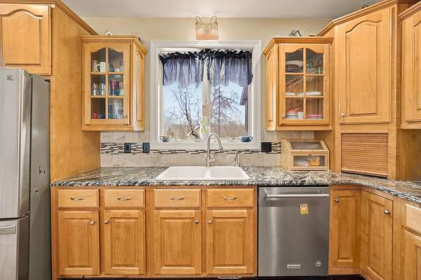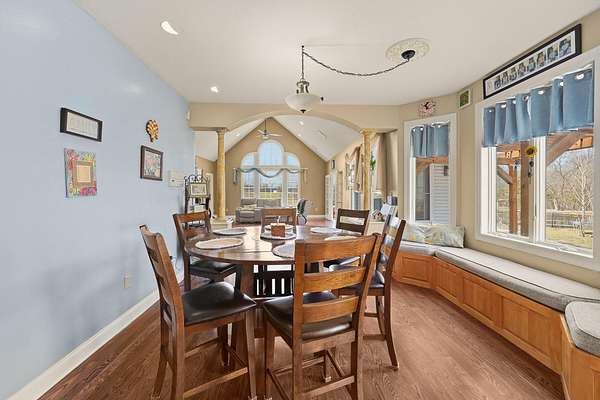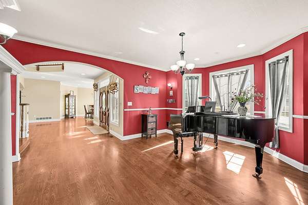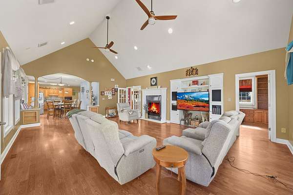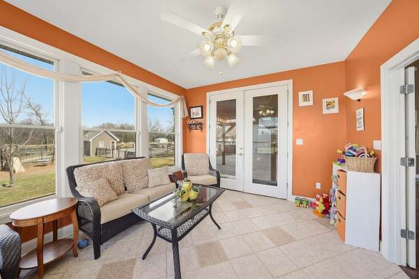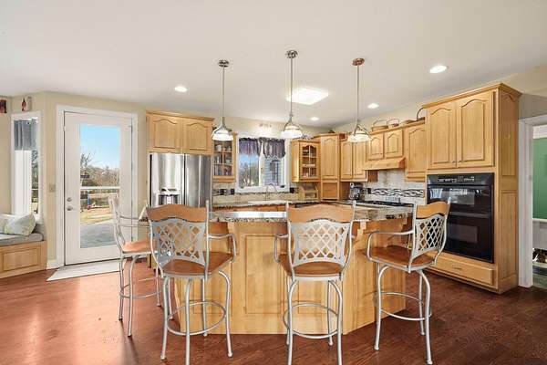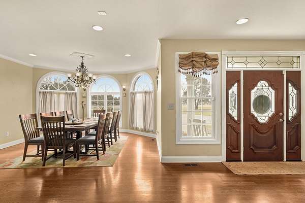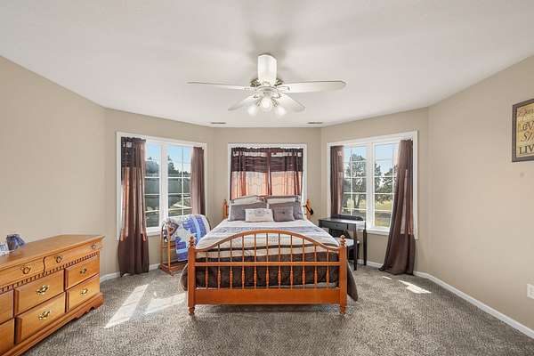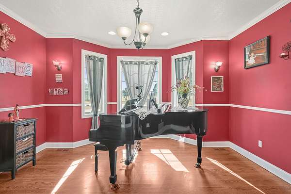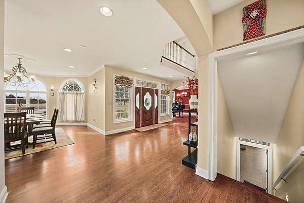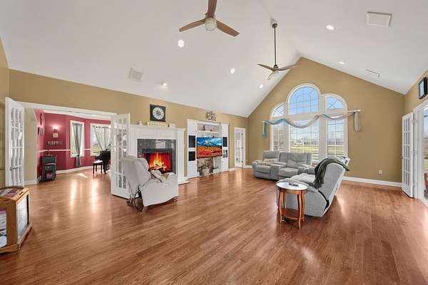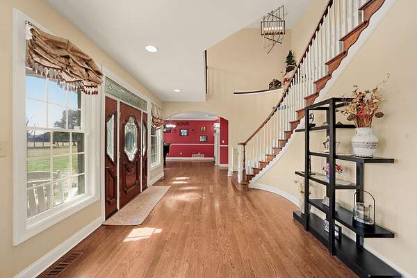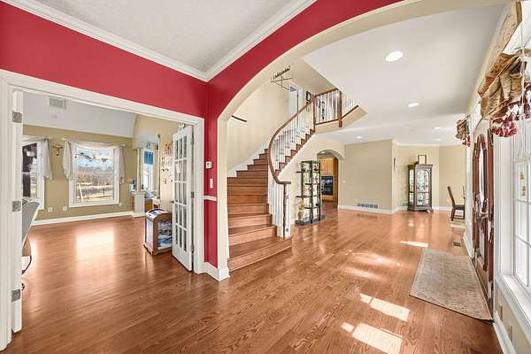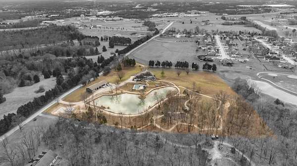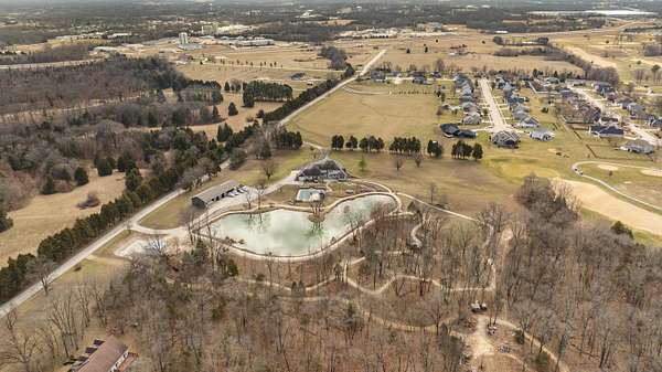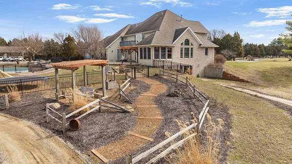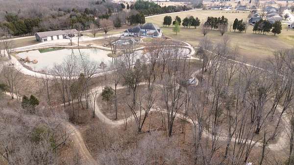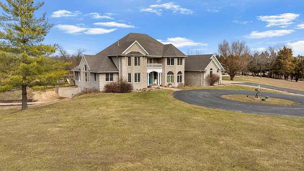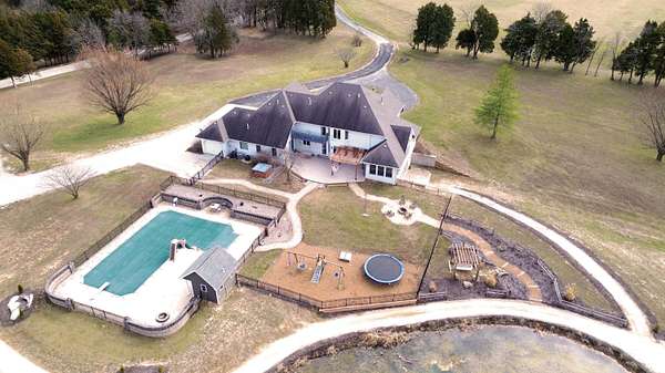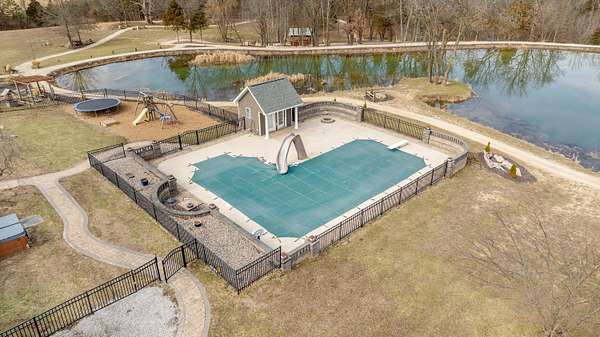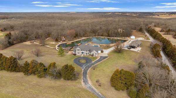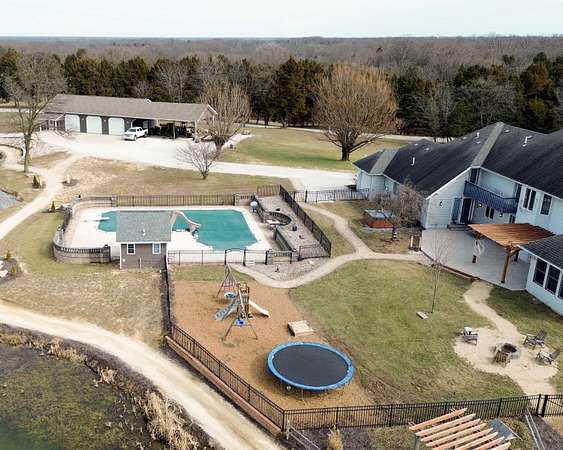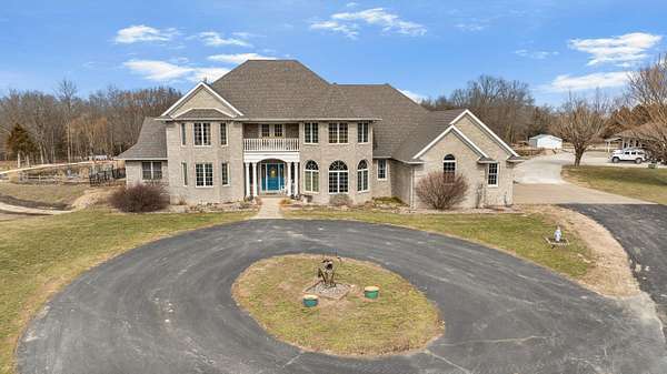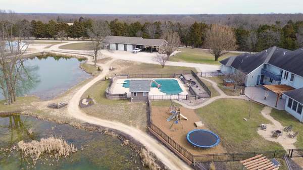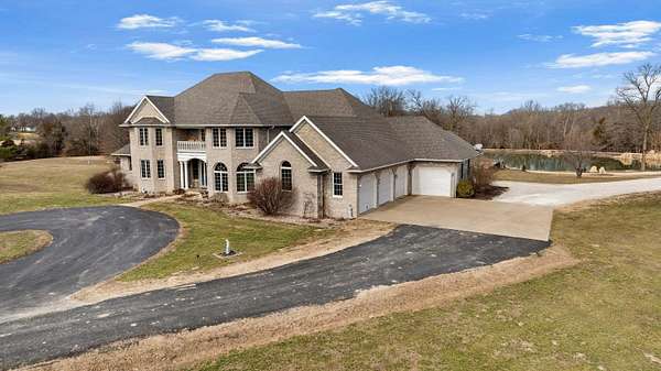Stunning 11-acre estate offering 4 beds, 4.5 baths, 5,731 finished sq ft and exceptional indoor/outdoor living. Main level features a formal living and dining room, vaulted living room with fireplace, sitting room with 2nd fireplace, office, and sunroom. Primary suite includes hardwood floors, crown molding, patio access, Jacuzzi tub, full shower, double vanity and walk-in closet. Upper level offers 3 bedrooms, hall bath, large foyer with balcony, and a 2nd primary suite with rear balcony. Walkout basement includes a spacious rec room, full wet bar, storm room and 2199 unfinished sq ft large storage areas. Outside features an in-ground saltwater pool with slide, diving board and pool house, a .50-acre stocked pond, walking trails and covered bridge. With over 7900 total Sq ft. Includes a 30*60 shop with epoxy floors, 2-post lift, 3 bays, 200-amp service and attached 30*40 pavilion, plus a 24*24 barn. Central vac, 3 HVAC systems, 3 water heaters, fenced playground and beautiful landscaping complete this rare property.
