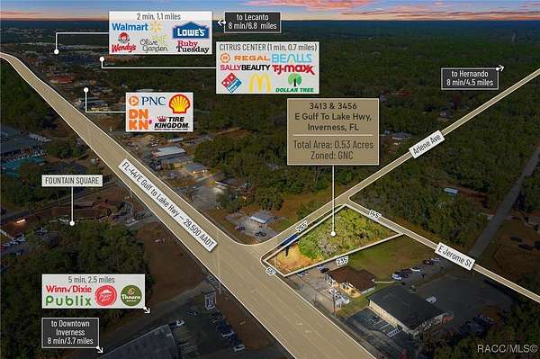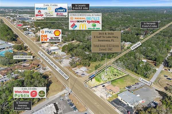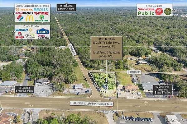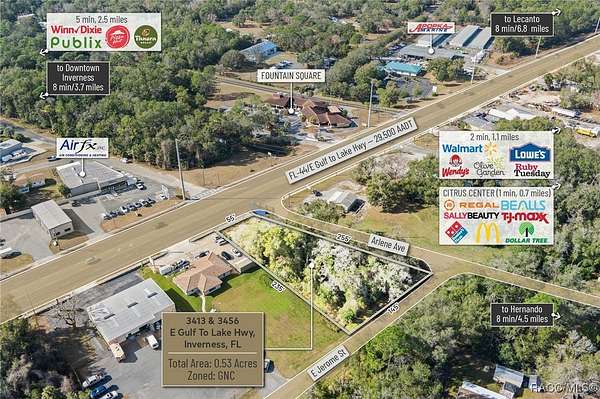 Located within the SR 44 Commercial Corridor in Citrus County, this 0.53-acre General Commercial property offers 55 feet of highway frontage, access to public water, and a future sewer connection. Positioned at the northeast corner of SR 44 and S Arlene Ave, it sits just 3.5 miles east of Downtown Inverness, home to major county offices and Citrus Memorial Hospital. With 1.3 miles of proximity to national retailers such as Walmart, Lowe's, TJ Maxx, and Regal Cinema, as well as multiple quick-service restaurants and financial institutions, this site offers excellent commercial potential. Its General Commercial zoning permits up to 70% site utilization, making it ideal for retail, medical offices, or professional spaces. The Inverness area supports 32,510 residents, while Citrus County's population exceeds 155,000. Growth is accelerating with the Suncoast Parkway Extension, providing quick access to Tampa International Airport and surrounding counties. As part of one of the largest MSAs in the country, this market remains affordable yet primed for expansion, with 60,000 vacant parcels, ongoing infrastructure investment, and zoning to accommodate future growth to 350,000 residents. This is a rare opportunity to invest in a high-growth region with natural preserves, waterways, an active adult community, and a favorable tax base. Secure your place in the Gem of the Florida Nature Coast today! Disclaimer: All information provided herein is for marketing purposes only and is not guaranteed for accuracy. Prospective buyers or tenants are encouraged to conduct their own independent due diligence. The seller, broker, and associated parties make no representations or warranties, expressed or implied, as to the accuracy or completeness of this information. All dimensions, zoning details, financial data, and other property-related facts should be independently verified. Please consult with appropriate licensed professionals before making any investment or purchasing decisions.