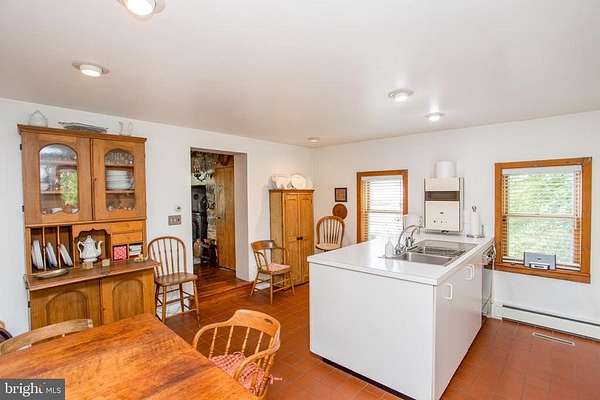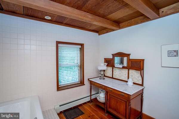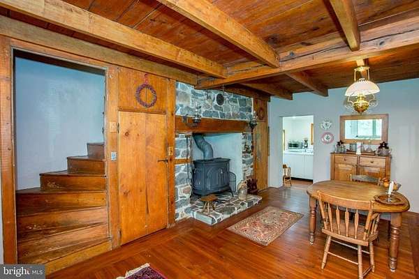 - Built-Ins, Carpet, Cedar Closet(s), Country Kitchen, Curved Staircase, Dining Area, Eat-In Kitchen, Exposed Beams, Island Kitchen, Stall Shower Bathroom, Table Space Kitchen, Traditional Floor Plan, Tub Shower Bathroom, Walk-In Closet(s), Wood Floors, Wood Stove