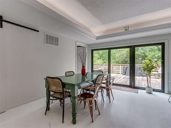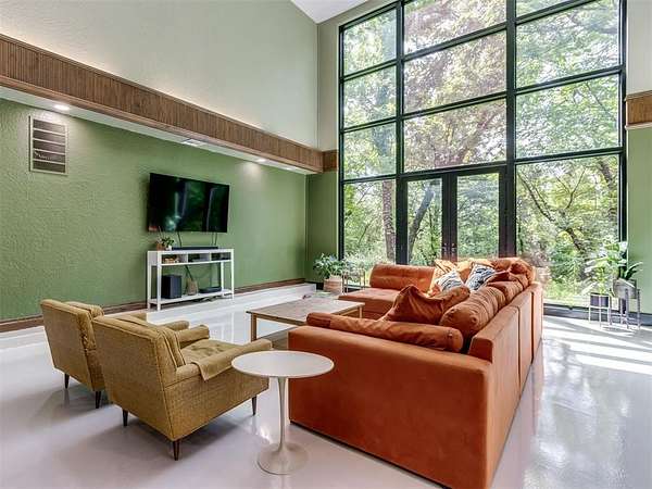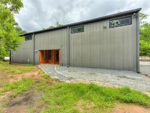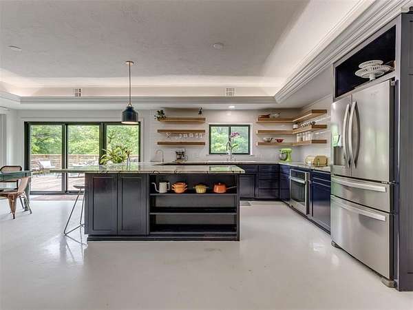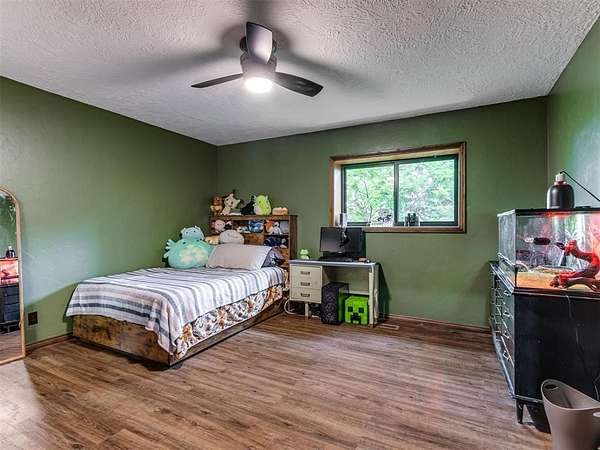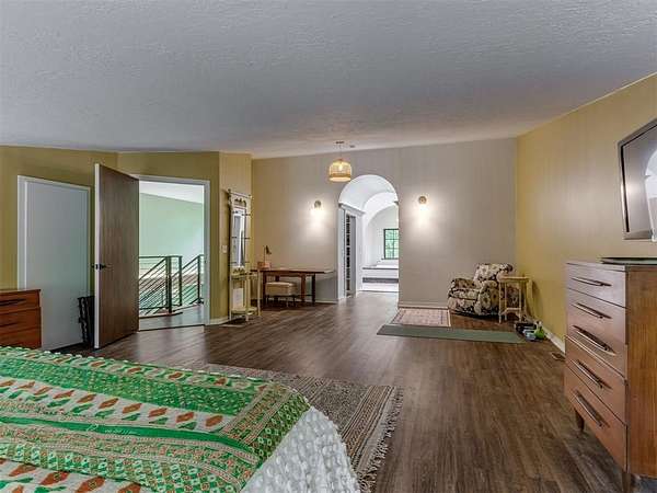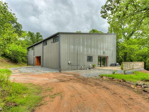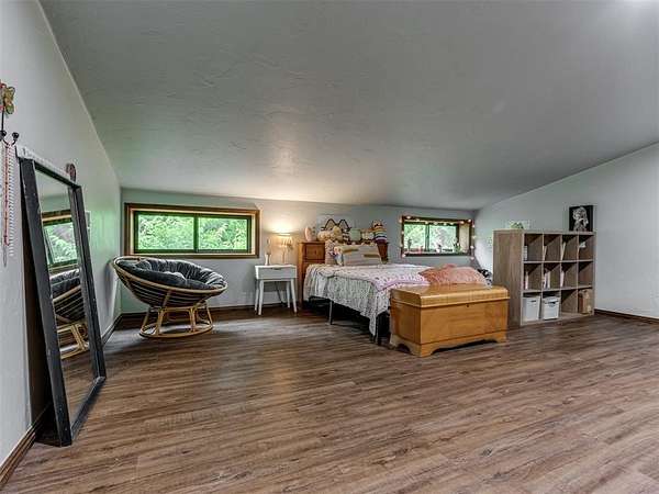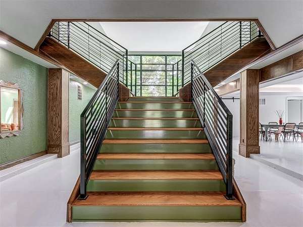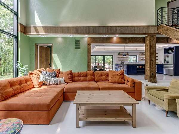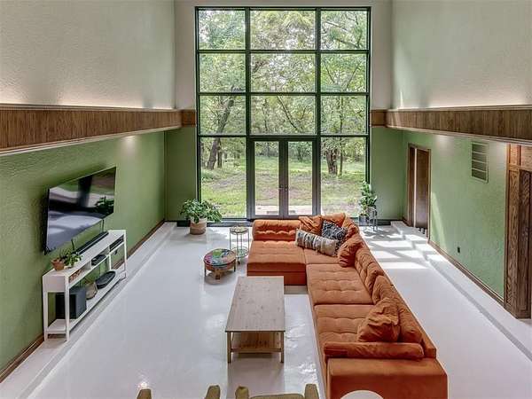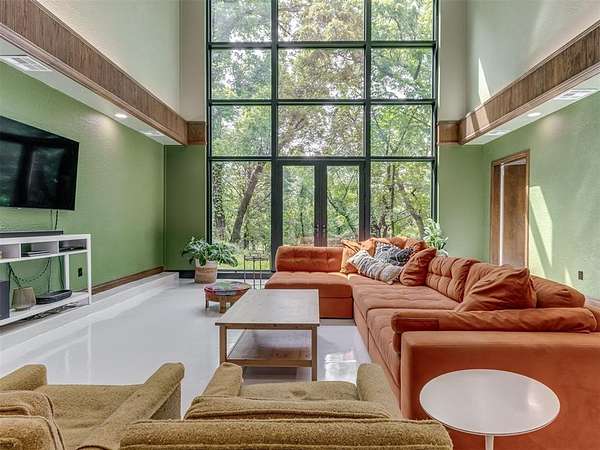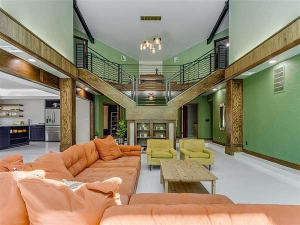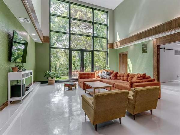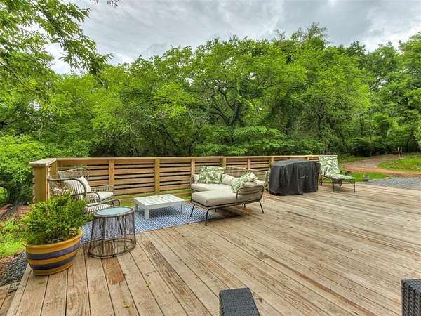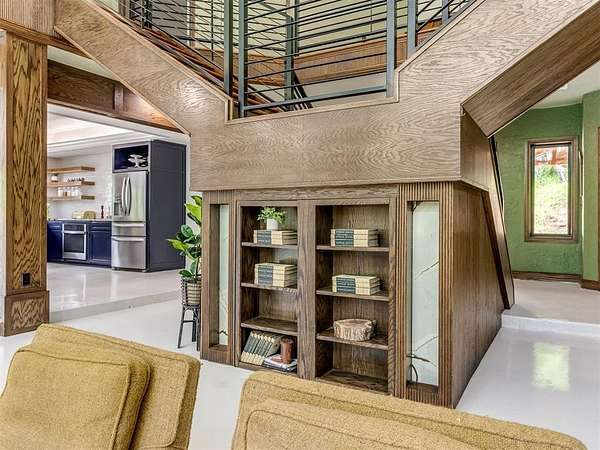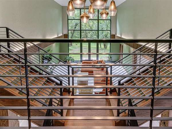 Price Reduced, Plus sellers are contributing $20,000.00 in concessions towards landscaping, closing costs, or rate buy down, buyers choice! Amazing renovation surrounded by a lush wooded 5 acre lot, with the feeling of seclusion and privacy yet still in the heart of OKC. Such a fun yet elegant style of Mid century modern, Spacious home with impressive soaring ceilings and amazing views. The unique split staircase at entry, will lead you up to spacious primary bedroom with large walk in closets and a truly breathtaking spa like en suite bathroom. At the other side of staircase/open hall balcony you will find two other large bedrooms with walk in closets and are connected by a rare true jack and jill style bathroom complete with 2 sinks & vanities, 2 separate toilets and tons of storage with shared bathtub/shower. There is also a "walk-through" room that leads into one of the bedrooms, (3rd upstairs bedroom option or office) from here you can climb up to the loft that makes the perfect fun game room for the kids. Head down either side of split staircase and you will find yourself on the landing that overlooks the substantial great room with an amazing view of the lush wooded back yard, framed in floor to ceiling Pella windows. This tremendous living space opens up to luxurious kitchen and dining area with gorgeous quartzite countertops, large pantry, ample storage and natural light. Off the dining room you can step outside onto a large deck that is perfect for gatherings and entertaining. Downstairs to the left of front door entry, another bedroom with its own full bath and additional entrance to/from the hall, perfect for guests. To the right of entry another large bonus room, perfect for den, office or library. Additionally there is another room downstairs with indoor storm shelter/safe room. This space can also be used for storage, workshop, or hobby room.