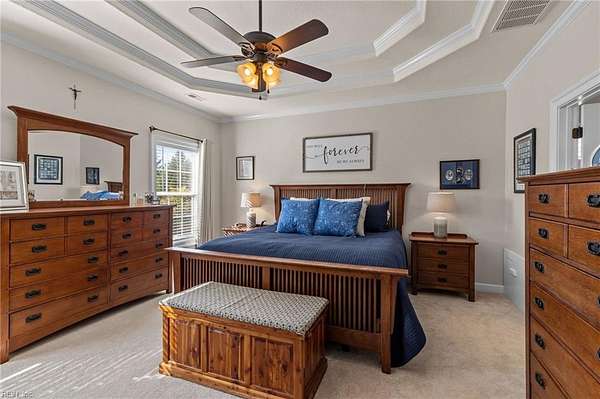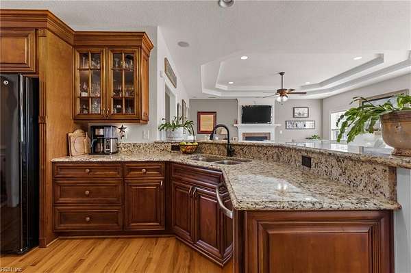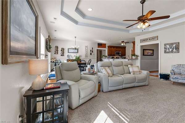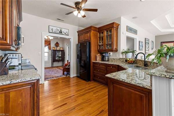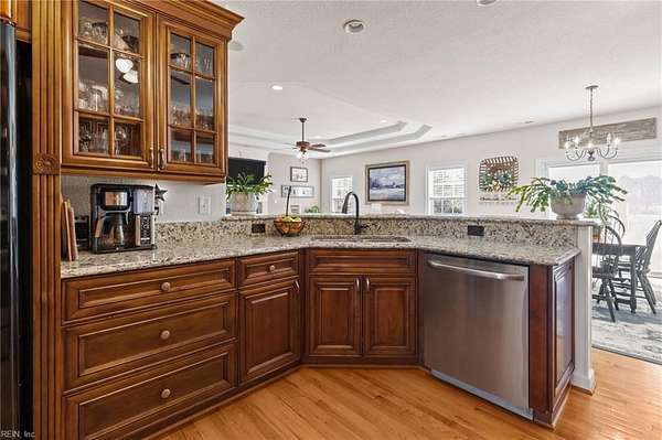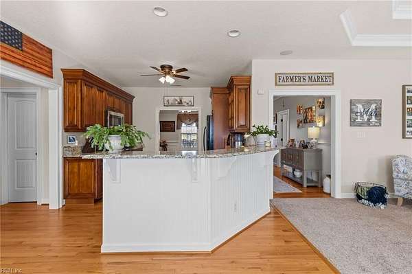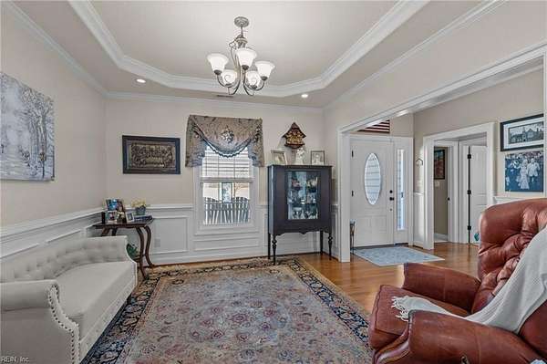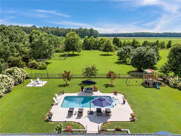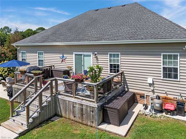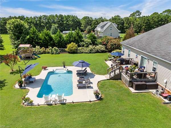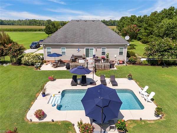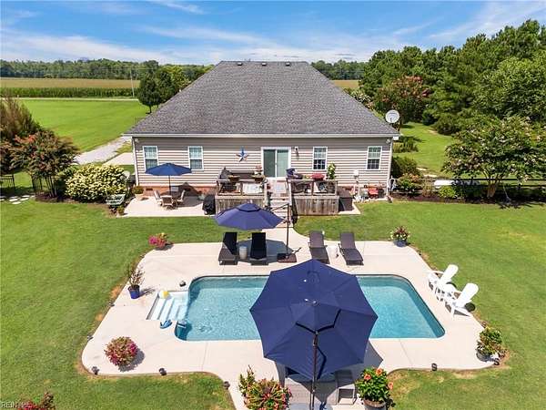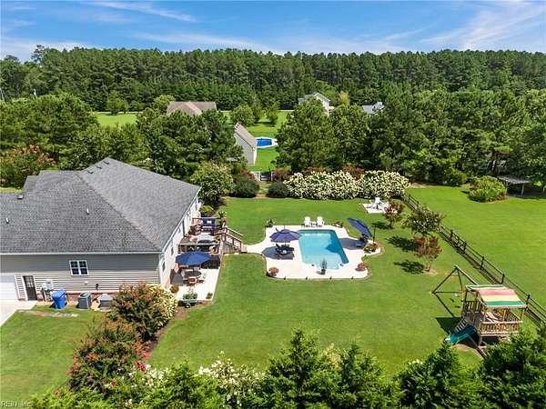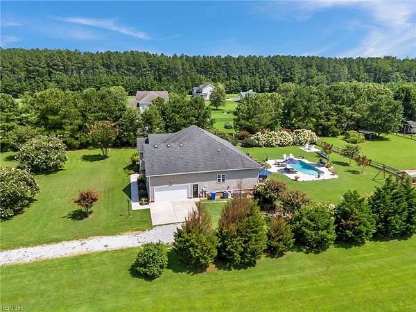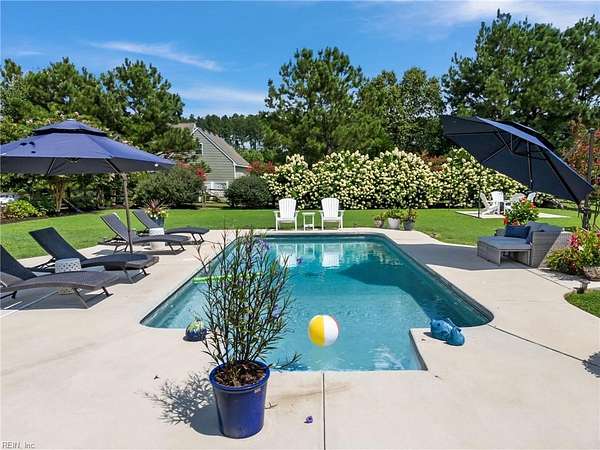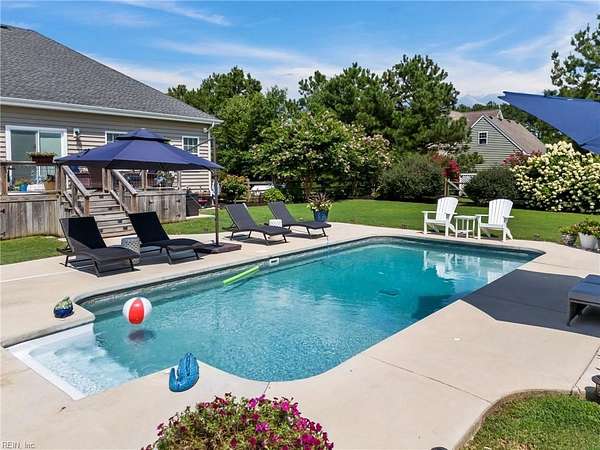 No detail is missed in this gorgeous and well maintained transitional Ranch situated on a private and beautifully landscaped 3 acre parcel in Southern Chesapeake. From the elegant Foyer to the large Great Room with gas fireplace that opens to the Eat in Kitchen with granite counters and upgraded cabinets, you will be pleased with every feature of this Home. The back yard oasis includes a stunning inground salt water pool, large deck, firepit area, and plenty of patio space to enjoy the tranquil setting. 1st floor primary suite with 2 walk in closets and full bath with jetted soaking tub, separate step in shower, and double bowl vanity. Add'l Features: Finished Room over Garage is 4th bedroom with it's own full bath; double tray ceilings throughout; hardwood flooring and newer carpeting; recessed lighting; walk in attic; whole house generator, 2 car garage with openers; surround sound system; 2 wells: one for house with softener system and one for yard; lots of storage space; and more!