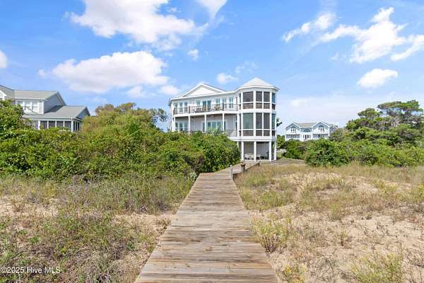Discover serenity and sweeping ocean views in this rare, oceanfront gem located in the gated Dunescape community on Holden Beach. This coastal oasis blends sun-soaked days with modern conveniences, delivering an inspired retreat for unforgettable memories. Unique oceanfront lot with over 1.5-acres providing direct private access to the beach, this home offers privacy, beauty, and ample room to live, entertain, or vacation in style. With nearly 3,000 square feet of coastal living, the home features 5 bedrooms, 5 full baths, and 1 half bath-perfect for large families or group stays. Bask in natural light streaming through a ''wall of windows'' overlooking the Atlantic, while enjoying an open-plan living, kitchen, and dining area that brings the outside in. Relax on the screened porch or across multiple decks (all perfect for sunrise, sunset, or starlight), all utilizing low-maintenance Trex decking. The amenities don't end there: Dunescape includes gated security, community pool and cabana, tennis and pickleball courts, a basketball court, volleyball, walking paths, and access out to Lockwood Folly Inlet and the Intracoastal Waterway. Holden Beach, a tranquil barrier island known for pristine beaches, marshland vistas, and a welcoming, family-friendly environment. Close to Wilmington NC and Myrtle Beach SC for restaurants, golf, entertainment and airports. Prime Holden Beach address with strong rental potential for investment buyers and Consistent appreciation in a growing coastal market. A true second-home escape with low-maintenance upkeep. Whether you're seeking a second home, rental investment, or the ultimate place for family memories, this classic oceanfront property checks every box. Experience the timeless charm of Holden Beach from a premier address at 342 Serenity Lane. Don't miss the chance to own in one of Holden Beach's most sought-after oceanfront enclaves...Dunescape.