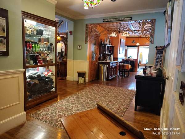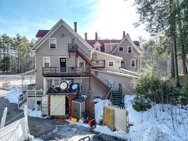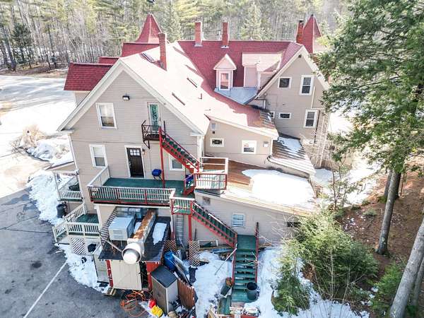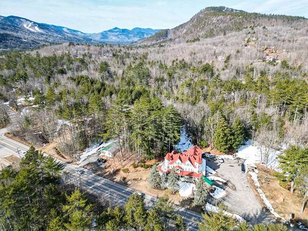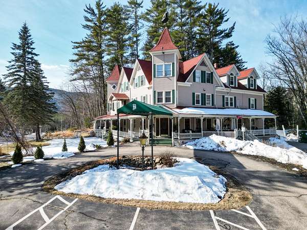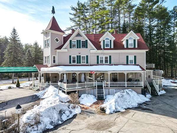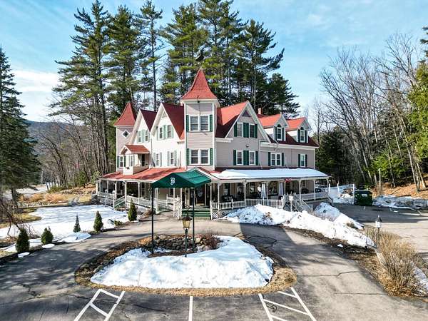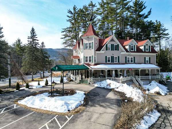 Prominent 2.5-story Victorian-era commercial property situated on 8.3 acres with exceptional frontage along US Route 302 in the heart of the Mount Washington Valley. Originally constructed in 1900, this 8,600 SF building underwent a comprehensive renovation in 2015 and features 12 bedrooms, 14.5 bathrooms, a two-bedroom owner's apartment, and a full basement totaling 2,484 SF of additional space. The building offers a gable and hip asphalt roof replaced in 2021, clapboard exterior with recent paint, hardwood and carpet flooring throughout, and drywall interior finishes. Climate control includes an oil-fired hot water heating system supplemented by 14 individually zoned mini-split HVAC units installed in 2017, providing 100% central air conditioning. The entire 7,933 SF living area is protected by a fire sprinkler system, and the property includes a fully equipped commercial kitchen walk-in with cold storage facility and a gas fireplace. Recent capital improvements include new mattresses (2022), updated smart TVs (2023), bathroom renovations, and fresh interior paint. A new septic system was engineered and installed in 2018 and the property is served by municipal water and features a paved driveway. The site is zoned town commercial on a level-to-rolling 8.3-acre parcel with delineated wetlands. The building includes a covered porch, outdoor grounds with gardens and walking paths, and dedicated parking. Located just 1.7 miles from Attitash Mountain Resort and Story Land, 7 miles from North Conway Village, and adjacent to the White Mountain National Forest, this property benefits from year-round tourist traffic in one of New England's premier four-season recreation corridors.