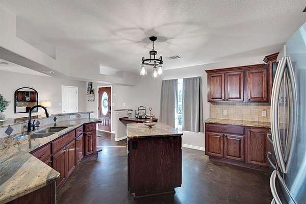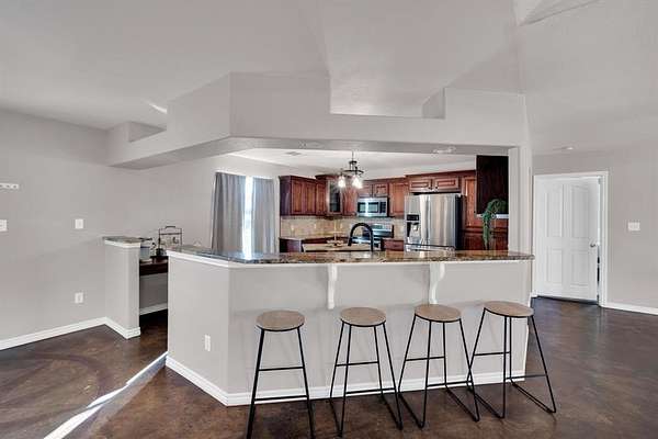 Set on 13 picturesque acres, this beautiful open concept rock home blends rustic charm with modern comfort. The property is fully cross fenced and features a stocked pond-perfect for fishing, relaxing, or taking in the sunset. A brand new two stall barn is ready for your cows or horses. Outdoor living is truly exceptional with a sparkling saltwater pool featuring new resurfacing and water feature. Entertain with ease on the large stamped concrete back patio and new fully equipped outdoor kitchen complete with a Blackstone grill, refrigerator, and sink. A newly added stone patio with propane fire pit offers the perfect spot for cozy nights under the stars. Additional highlights include an automatic iron gate for privacy, a large carport, and plenty of room to roam. This exceptional property has been loved and taken care of and offers the best of country living!