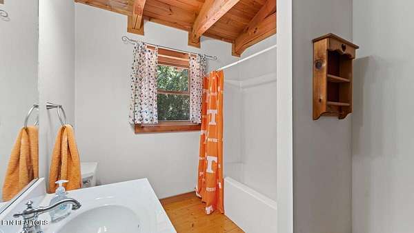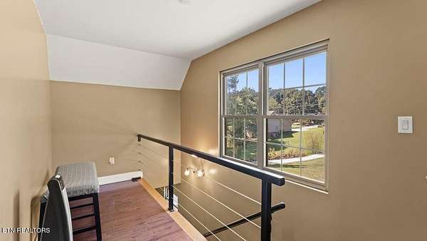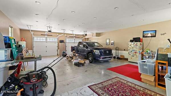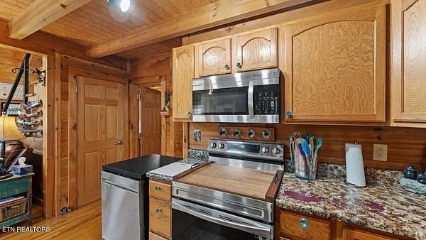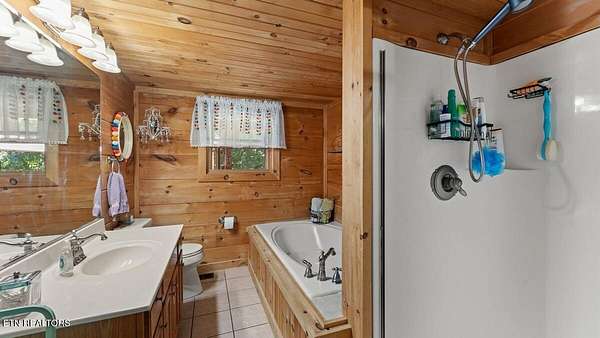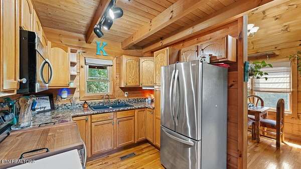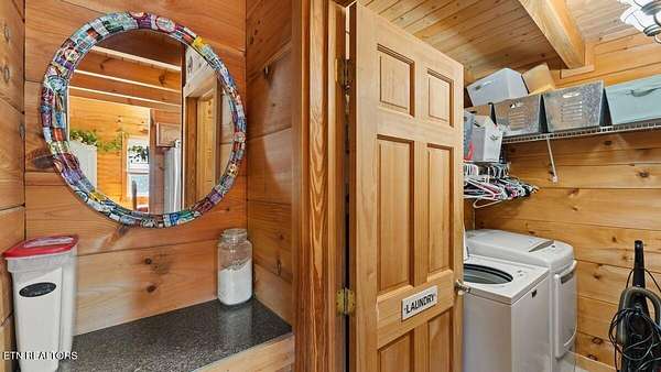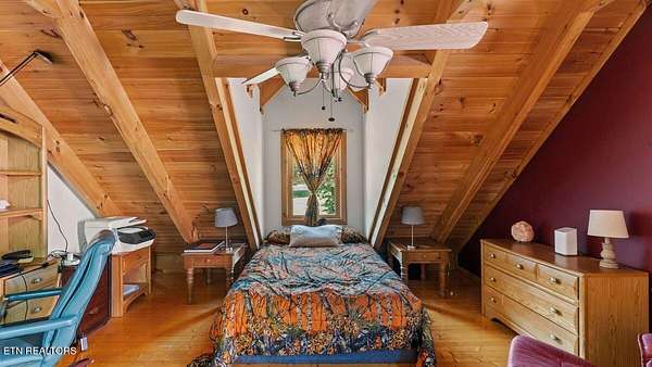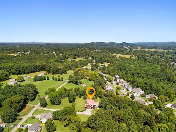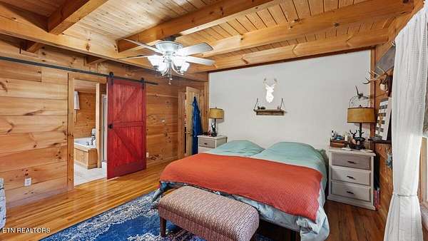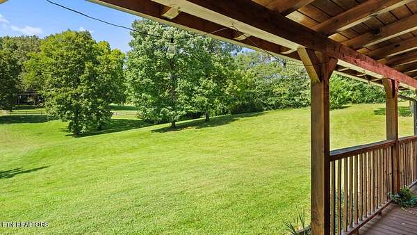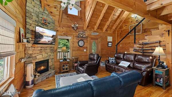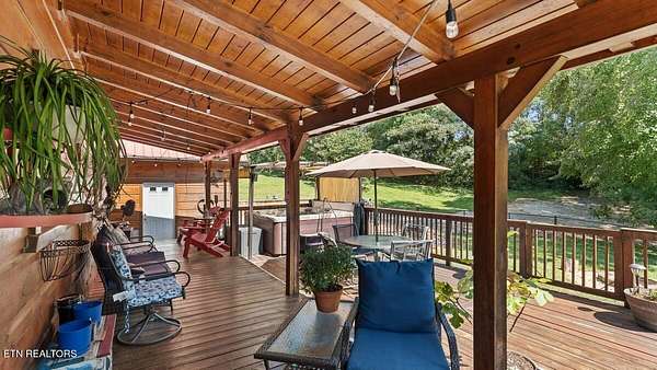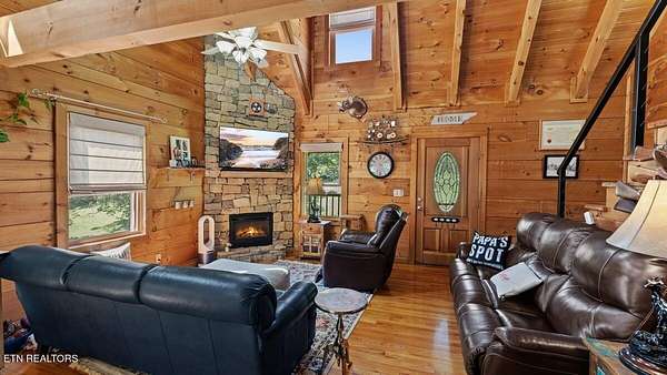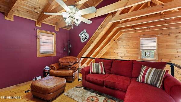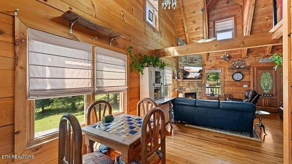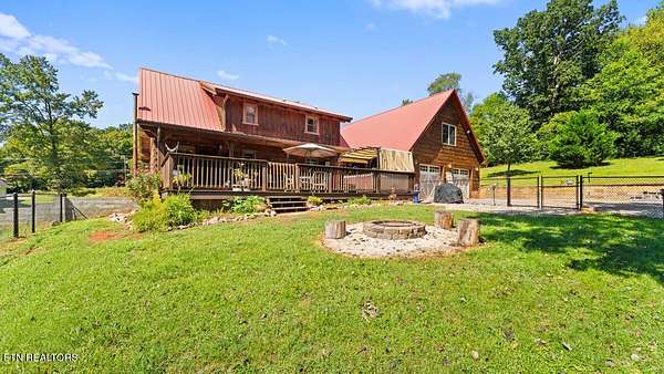 Nestled in the serene landscape of South Knoxville, this dream home offers an ideal blend of rustic charm and modern amenities. Spread across four rolling acres, the property ensures ample space and privacy for those yearning for a peaceful retreat. The distinctive log home features a unique ''barn quilt'' design, adding an artistic flair to its rustic aesthetic. Inside, the main living room stands out with a stacked stone fireplace and soaring cathedral ceilings and neutral Roman window shades throughout the living space creating a warm and inviting atmosphere for cozy gatherings. The modern kitchen comes equipped with stainless steel appliances, including a washer and dryer, and a cozy dining space perfect for intimate meals or entertaining guests. On the main level, you'll find the master suite. The stairs, featuring a modern cable railing design, lead to an upstairs loft area that overlooks the living room, offering a stunning view and additional living space. The upper-level bedroom is an ensuite, making it an ideal retreat for guests or family members seeking privacy. With a total of three bedrooms and four bathrooms, the home is well-suited for both family living and entertaining guests. Additional amenities include a huge detached garage with space for over five vehicles, perfect for car enthusiasts or those in need of extra storage. The garage also boasts an upstairs apartment, which can serve as an in-law suite, guest quarters, or a rental opportunity. Outdoors, the covered front porch and back deck offer breathtaking country views, while the hot tub, which conveys with the property, provides a perfect spot to relax and unwind. The lower level is currently utilized as an additional living space, offering versatility for a home office, recreation room, or guest accommodations. This property is a true gem, offering the peace and beauty of country living with the convenience of modern features, ready to welcome you as either a family home or a serene getaway. The garage apartment is currently rented and can be used to generate extra income. Also, there is a smaller basement apartment...and the lot is big enough to build an additional home!!
