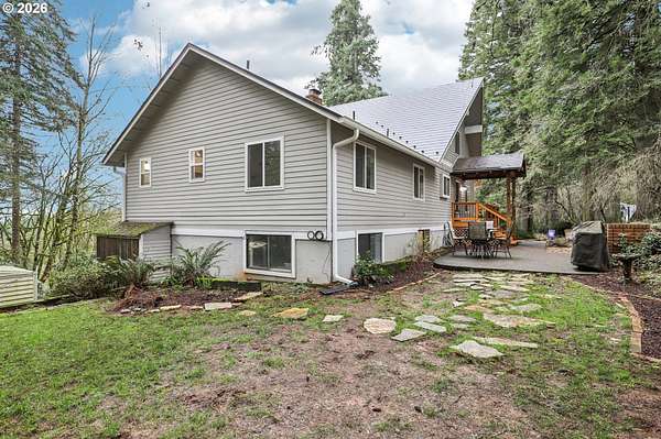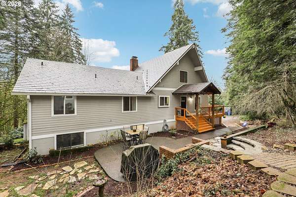 Covered front porch leads into this spacious home with wrap-around deck. Living room features a pellet stove fireplace with stone surround up to the ceiling, mantle and hearth, French door access to wrap-around deck, window wall with territorial views. Breakfast bar kitchen offers newer stainless appliances, including built-in dishwasher, smart glass cooktop range, refrigerator, along with a pot filler, range hood, granite, abundant cabinetry some with pull-outs, pantry storage, recessed lighting, tray ceiling. Separate dining showcases board and batten wainscoting. Main-level primary en-suite includes French doors with territorial views, double closets, clear fir vaulted ceiling, dual-sink tiled vanity, tiled shower with dual shower heads. Two additional bedrooms on the main offer closets, one with ceiling fan. Lower level provides two more bedrooms with closets, one with built-in shelving the other with ceiling fan. Laundry room with utility sink, large storage room, and exterior access. Full bath with granite vanity and tiled shower. Upper-level bonus room features a pellet stove fireplace with stone surround, mantle and hearth, wet bar with sink and beer tap, slider to balcony with territorial views, ceiling fan, fir wood sloped ceiling. Additional interior features: staircase with wood and engineered hardwood treads and iron balusters. Engineered hardwood, carpet, vinyl flooring. Attic storage with floor lights. Assumable Starlink internet. Exterior amenities include: covered porch, wrap-around deck, expansive patio and fire pit. Two-car garage with wood-burning fireplace, built-ins and openers. 5.09 acres with three cross-fenced and gated pastures. Four outbuildings include: chicken coop, goat mini barn, powered workshop, animal outbuilding. Raised beds, dog run, blueberry bushes, plum, apple and pear trees. Permalock metal roof brown slate design with transferable warranty. RV parking. Mortgage savings may be available for buyers of this listing.