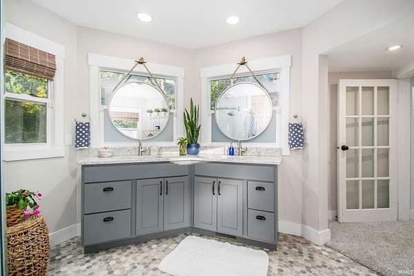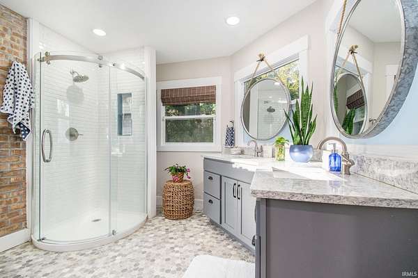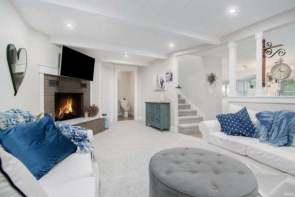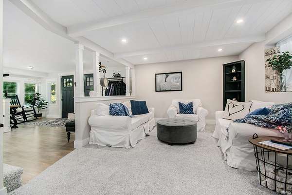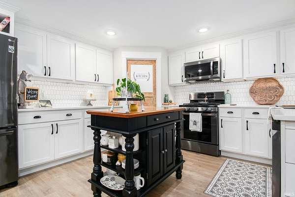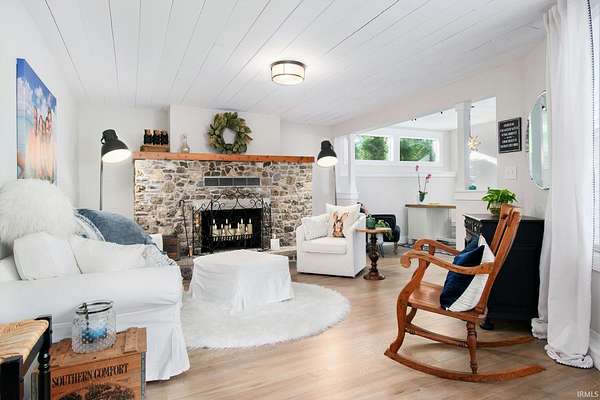 Step inside this updated, one-of-a-kind home where fairytale cottage charm meets modern comfort. The light-filled kitchen features crisp white cabinetry, a unique tile backsplash, and sleek black stainless-steel appliances. The living room offers a stone fireplace and white shiplap ceiling, creating a warm, inviting atmosphere. A sunny flex space just off the living room adds versatility--ideal for a home office, creative studio, playroom, or cozy reading nook with backyard views. Upstairs, the primary suite feels like a private retreat with a striking floral accent wall and an ensuite bath featuring dual vanities, circular mirrors, and exposed brick accents. Outside, the home's distinctive architecture shines with a turret detail and tiered rooflines set among mature trees on 1.6 private acres rich with abundant wildlife, creating a peaceful storybook setting. A detached third-car garage and workshop provide ample space for storage, hobbies, or creative projects.