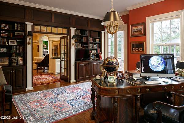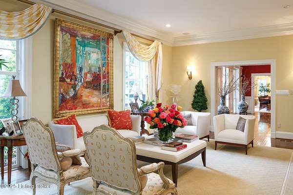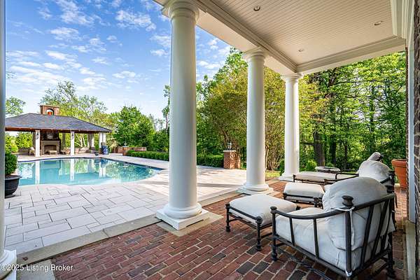 Twin Leaf | A Landmark Glenview Estate Inspired by Monticello Perched atop nearly seven acres of rolling Kentucky countryside in prestigious Glenview, Twin Leaf is a timeless masterpiece of design and craftsmanship-an extraordinary estate inspired by Thomas Jefferson's Monticello. Privately tucked behind a gated entrance, the approach to the home winds gracefully up the hill, offering a sense of anticipation that culminates in a striking arrival at one of Glenview's most distinguished properties. A formal central hall welcomes you into the heart of the home, elegantly flanked by gracious living and dining rooms-ideal for both refined entertaining and intimate gatherings. Every detail has been thoughtfully considered for comfort and function, from the chef's kitchen with top-tier appliances and butler's pantry, to the hearth-warmed eat-in space that invites daily connection. Bathed in natural light, dual sunrooms on either side of the home extend the living space and provide tranquil retreats throughout the day. At the core of the home, a grand central entertaining room flows into a handsome bar and richly appointed home office, both refined yet relaxed in tone. Just beyond, at the rear of the home, you'll find the true family room, a spacious, light-filled sanctuary designed for everyday living. With generous proportions, a cozy fireplace, and walls of French doors, this inviting space effortlessly connects to dual limestone terraces, the heated swimming pool, and a fully covered pool house. It's a seamless indoor-outdoor experience, perfect for both quiet evenings and lively gatherings. The pool house itself is a showpiece, crafted with imported cypress beams and a slate roof, and plumbed for a full outdoor kitchen and bath. Surrounded by lush landscaping and intentional design, the entire outdoor living area offers the feel of a private resort. Upstairs, dual staircases lead to the luxurious primary suite, a private haven featuring dual bathrooms, multiple walk-in closets, a fireplace, a sitting room, and access to a second-story terrace with sweeping views of the grounds. Three additional ensuite bedrooms complete the level, each with their own full bath and elegant appointments. The third floor has been artfully reimagined as a bunk room and media lounge, offering charm and flexibility for guests of all ages. The lower level continues to impress with a custom-designed, climate-controlled wine cellar for 2,200 bottles, a state-of-the-art exercise room with sauna and full bath, a private home theater, and an attached three-bay garage. Also on this level is a fully equipped guest apartment with its own kitchen, bedroom, and bathroom, ideal for extended family, guests, or live-in support, and offering walkout access to a secluded, sunken rose garden that feels like a hidden European courtyard. Twin Leaf is more than a home, it is a legacy estate, offering a rare blend of architectural significance, modern luxury, and natural beauty. Opportunities of this caliber are exceptionally rare in Glenview. For private showings and more information, please contact the listing agents.